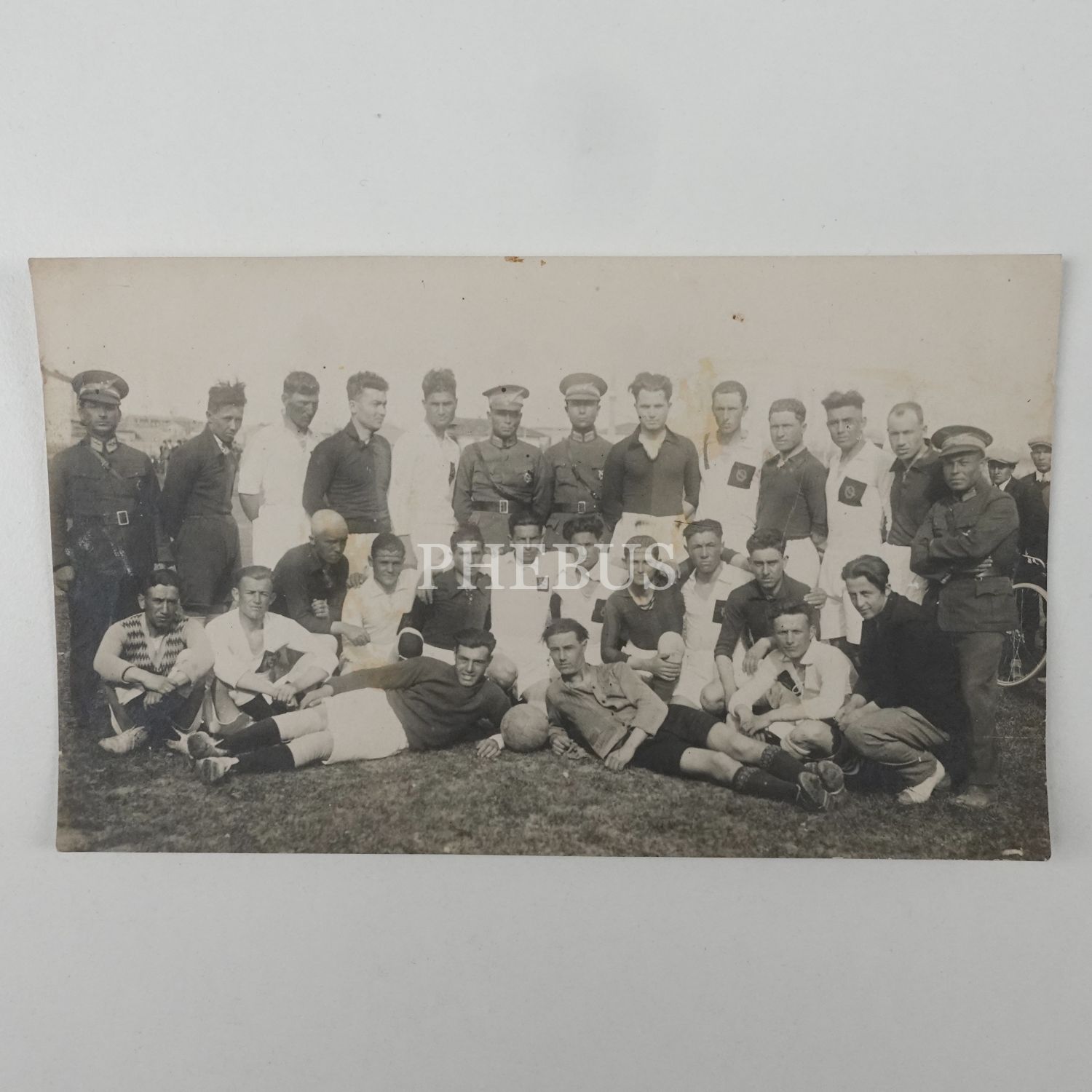 Türk Hava Kuvvetleri bünyesinde oluşturulan futbol takımında yer alan genç pilot adaylarının hocaları olan Türk subaylarıyla aldırdıkları toplu hatıra fotoğrafı, 15x9 cm...