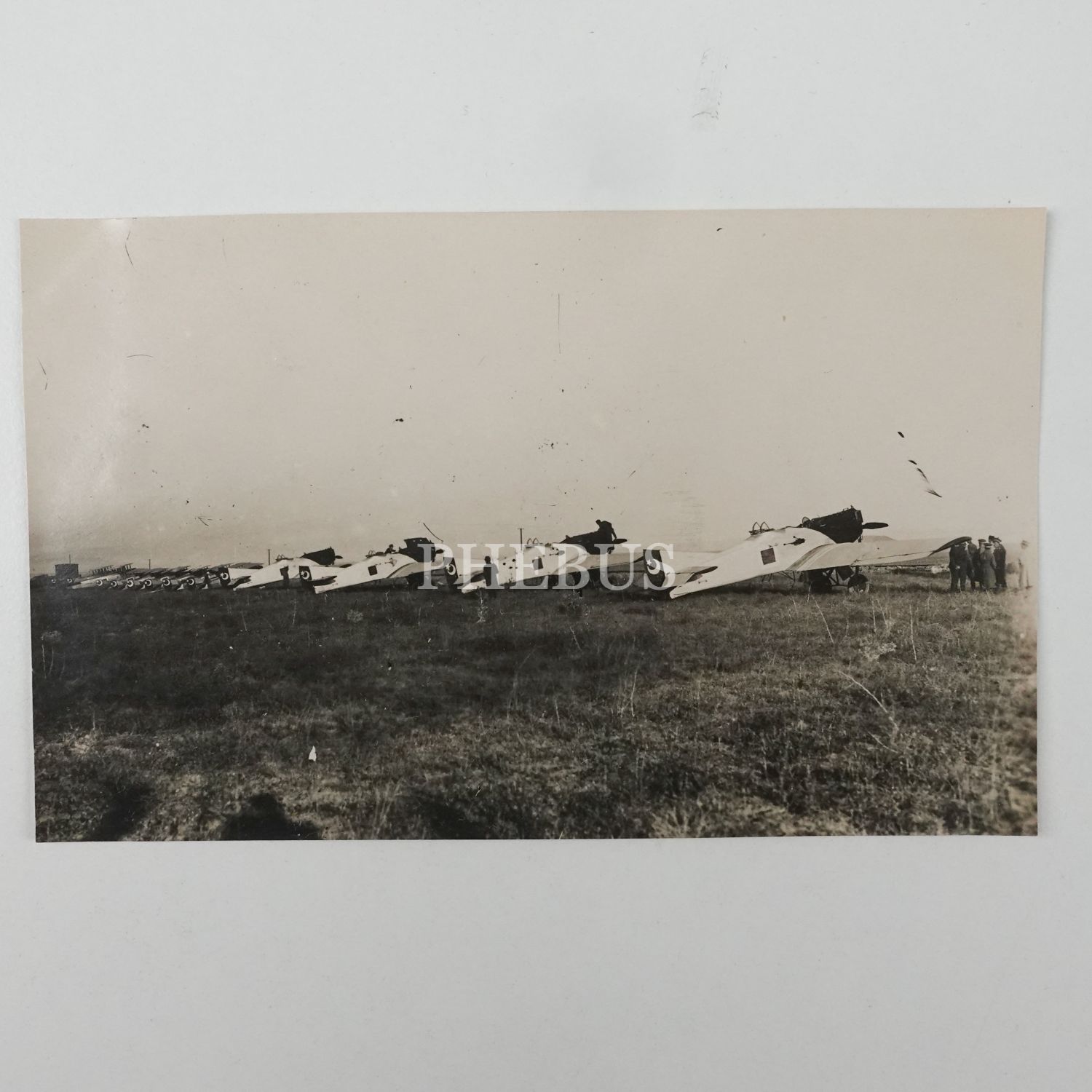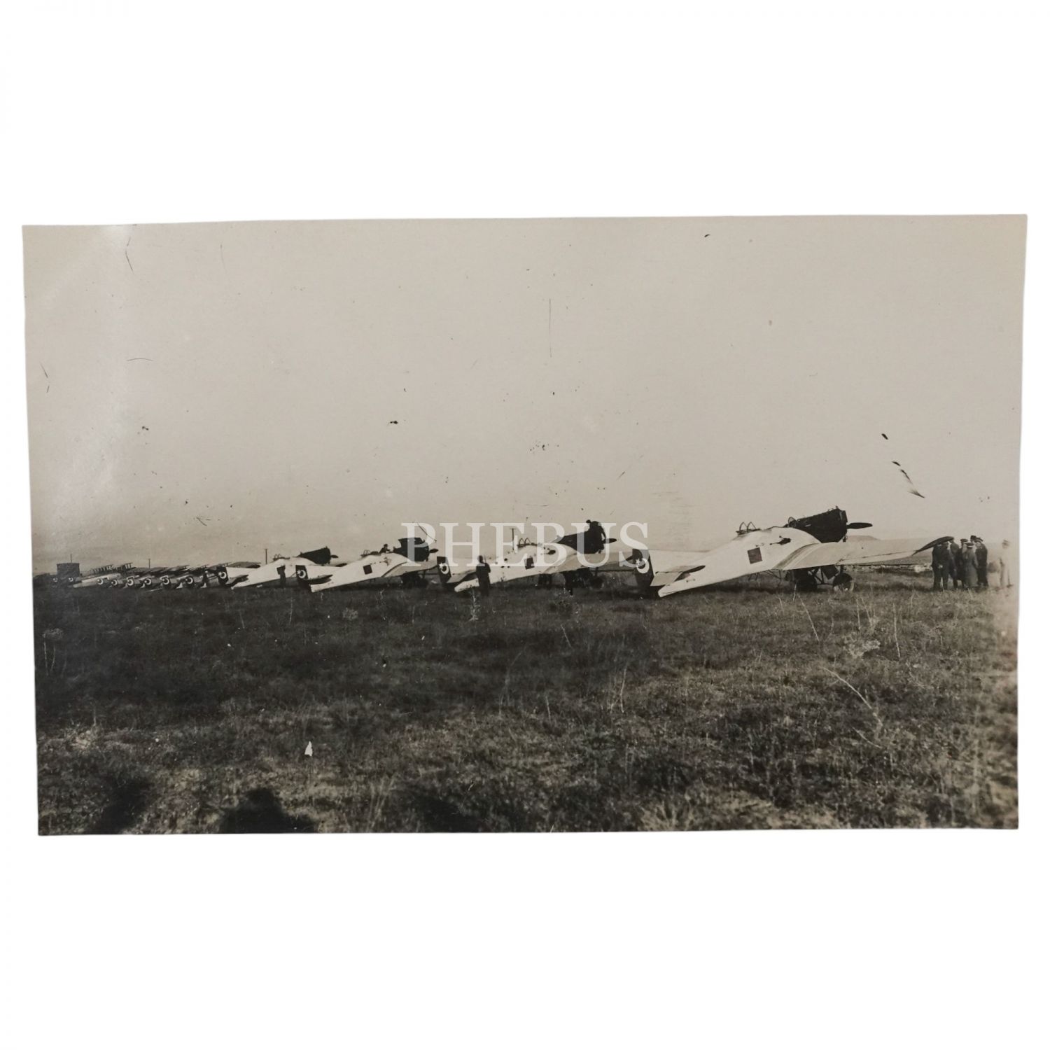 Bir hava üssünde sıralanmış Türk uçakları ve subaylar, 14x9 cm...