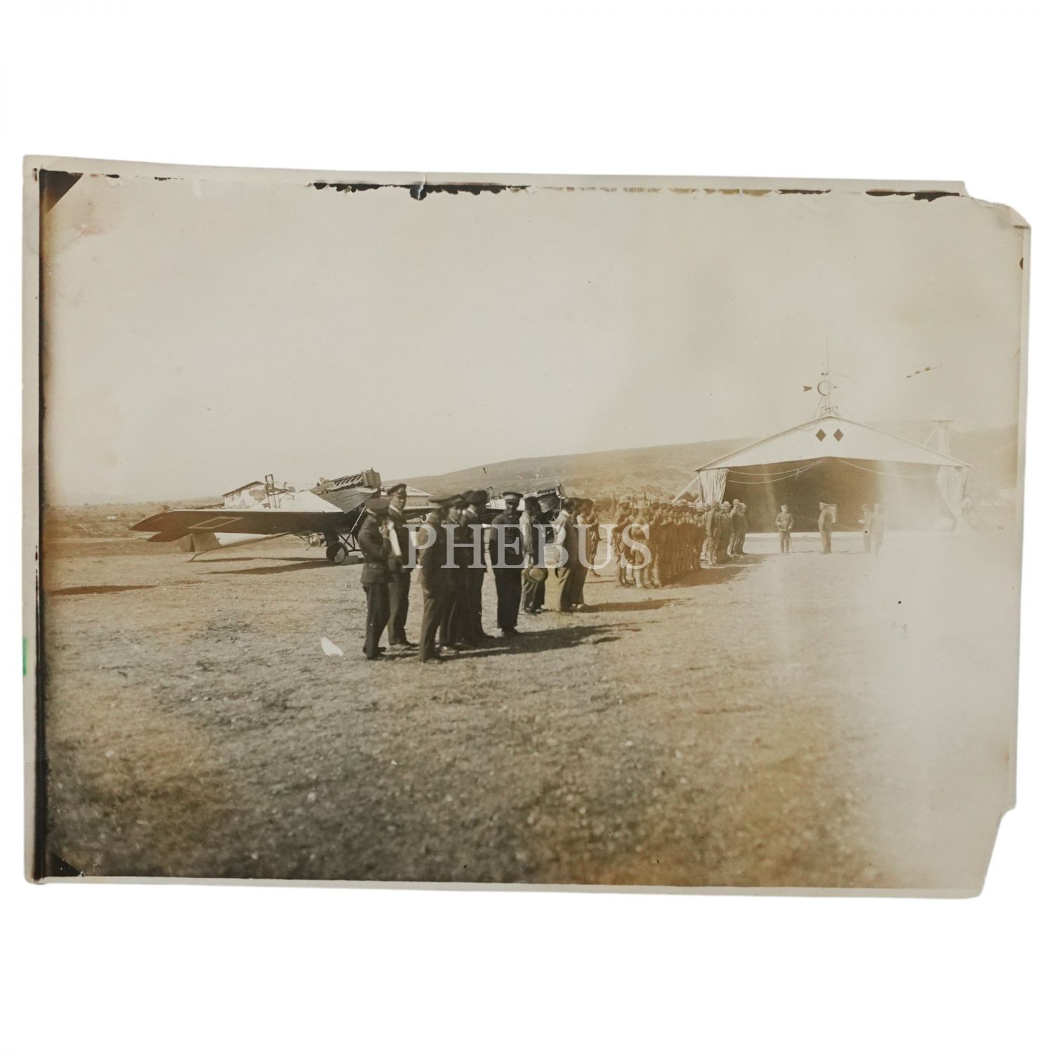 Bir hava üssü denetlemesinden uçakların, subayların ve erlerin görüldüğü enstantane fotoğraf, 18x13 cm...