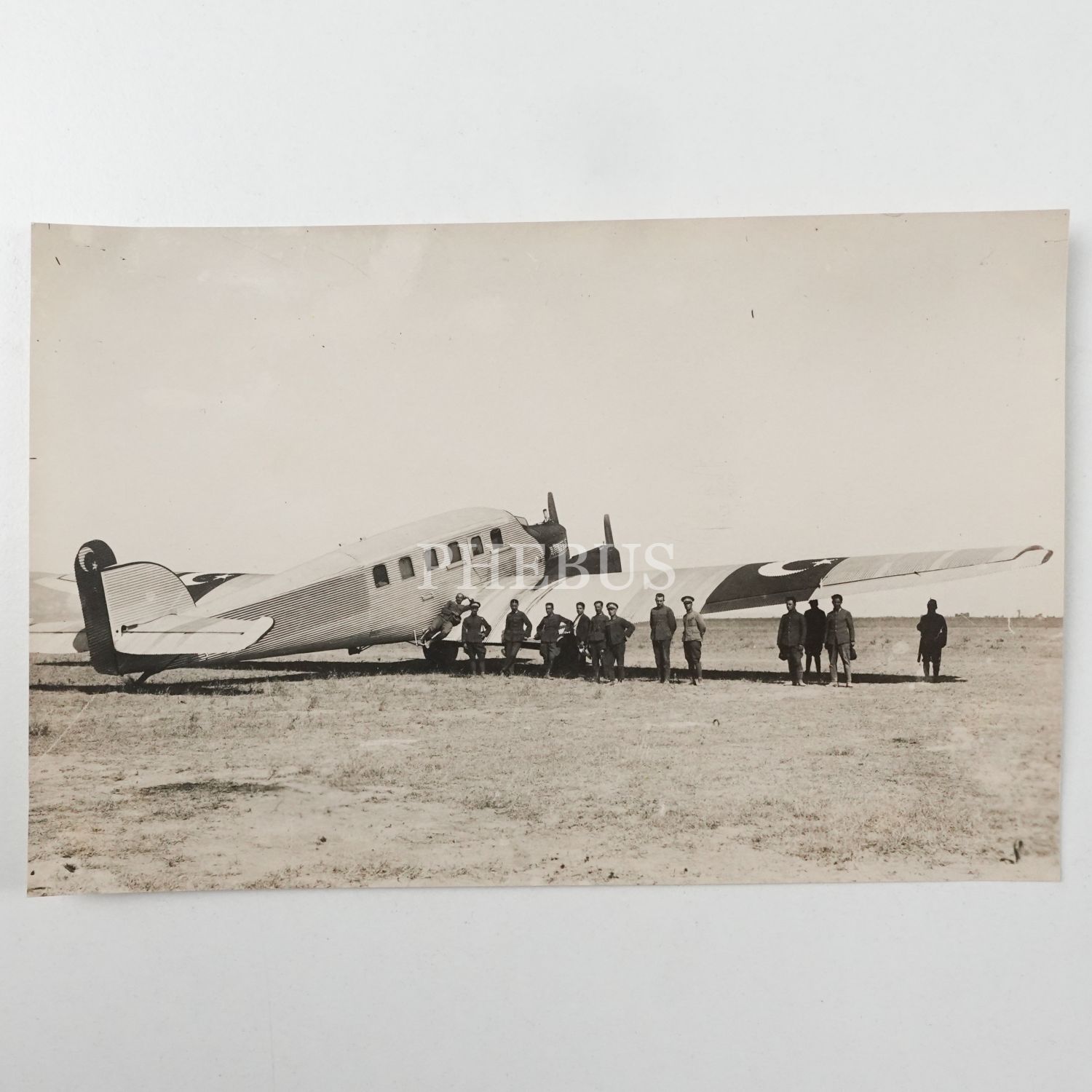 Ay-yıldız kanatlı ve kuyruklu, Junkers model yolcu uçağı önünde subaylar, 14x9 cm...