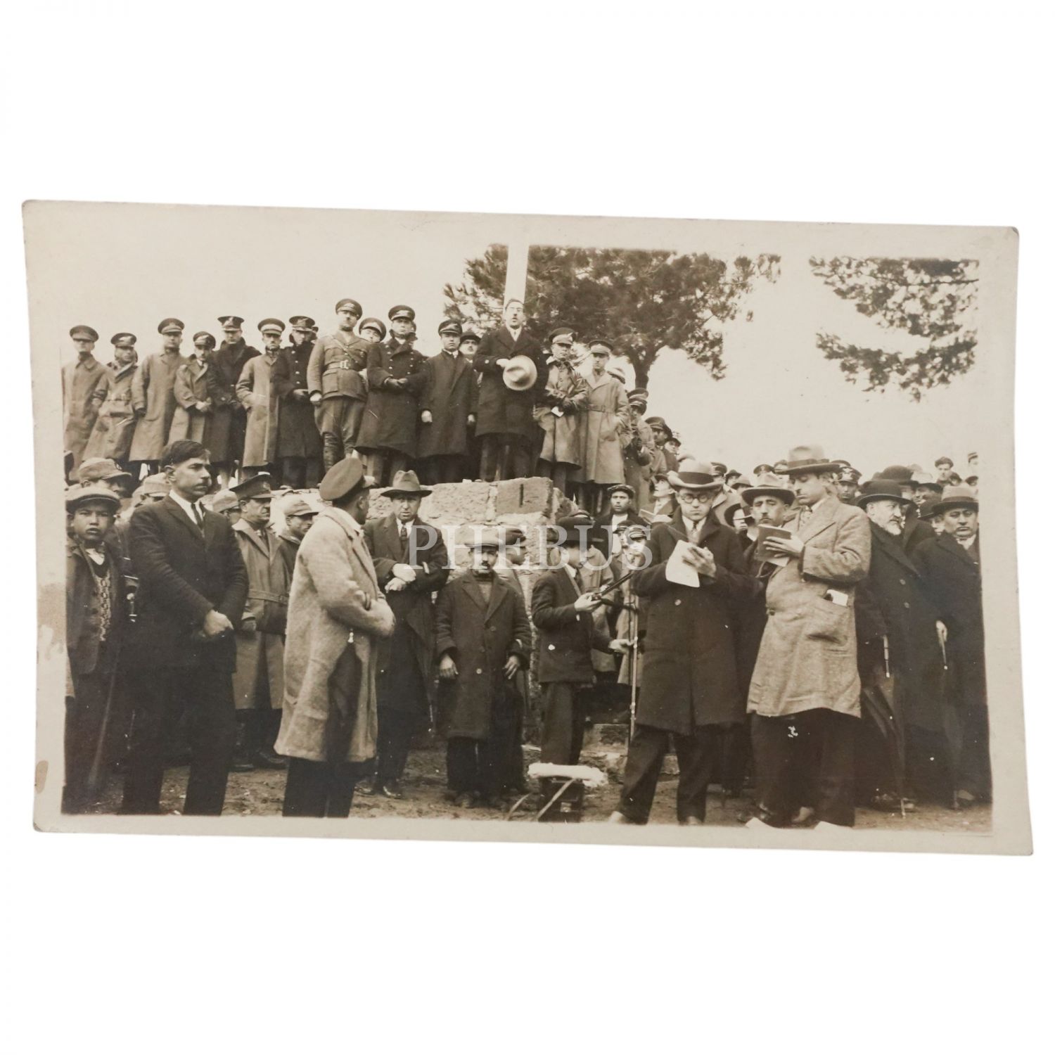 Havacı subayların, gazete muhabirlerinin ve sivil vatandaşların görüldüğü, muhtemelen bir pilotun cenaze töreninde çekilmiş enstantane fotoğraf, 14x9 cm...