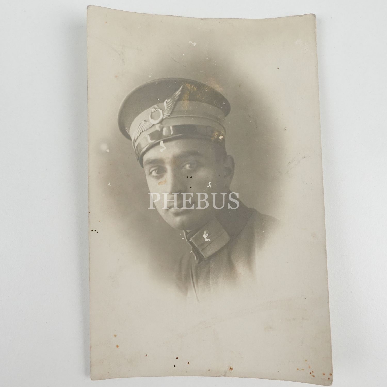 Şapkası havacı kokartlı bir Türk subayının stüdyo hatıra fotoğrafı, 9x14 cm...