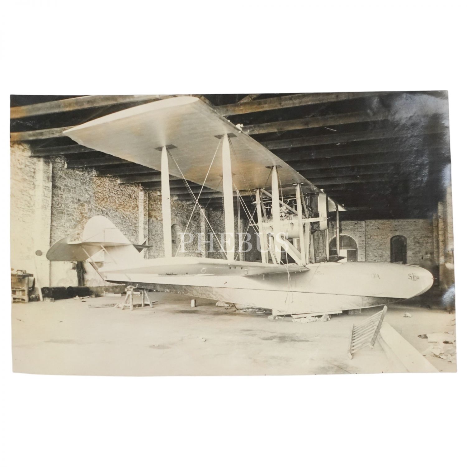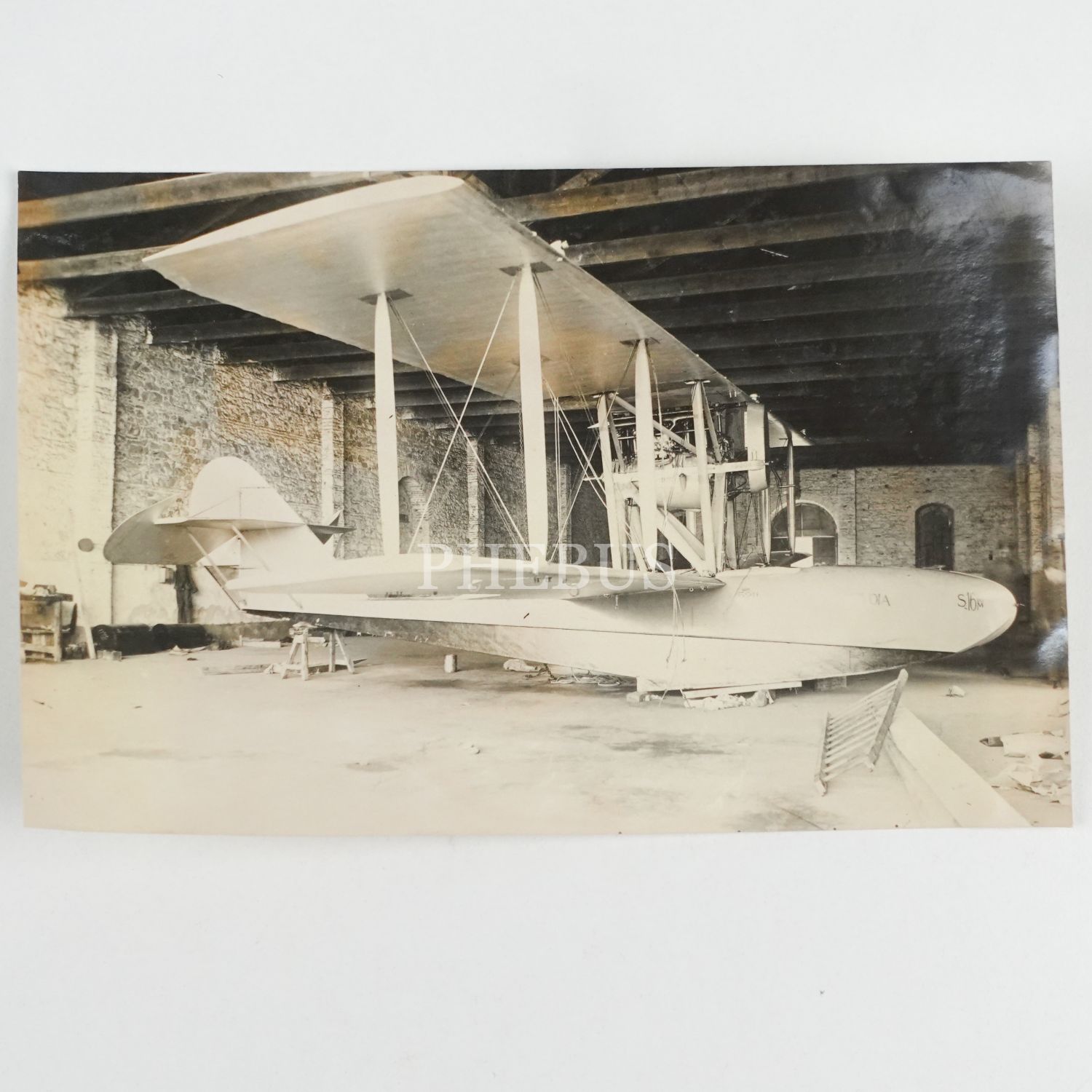 Hangar içinde bakıma alınan Savoia model İtalyan deniz uçağı, 17x11 cm...