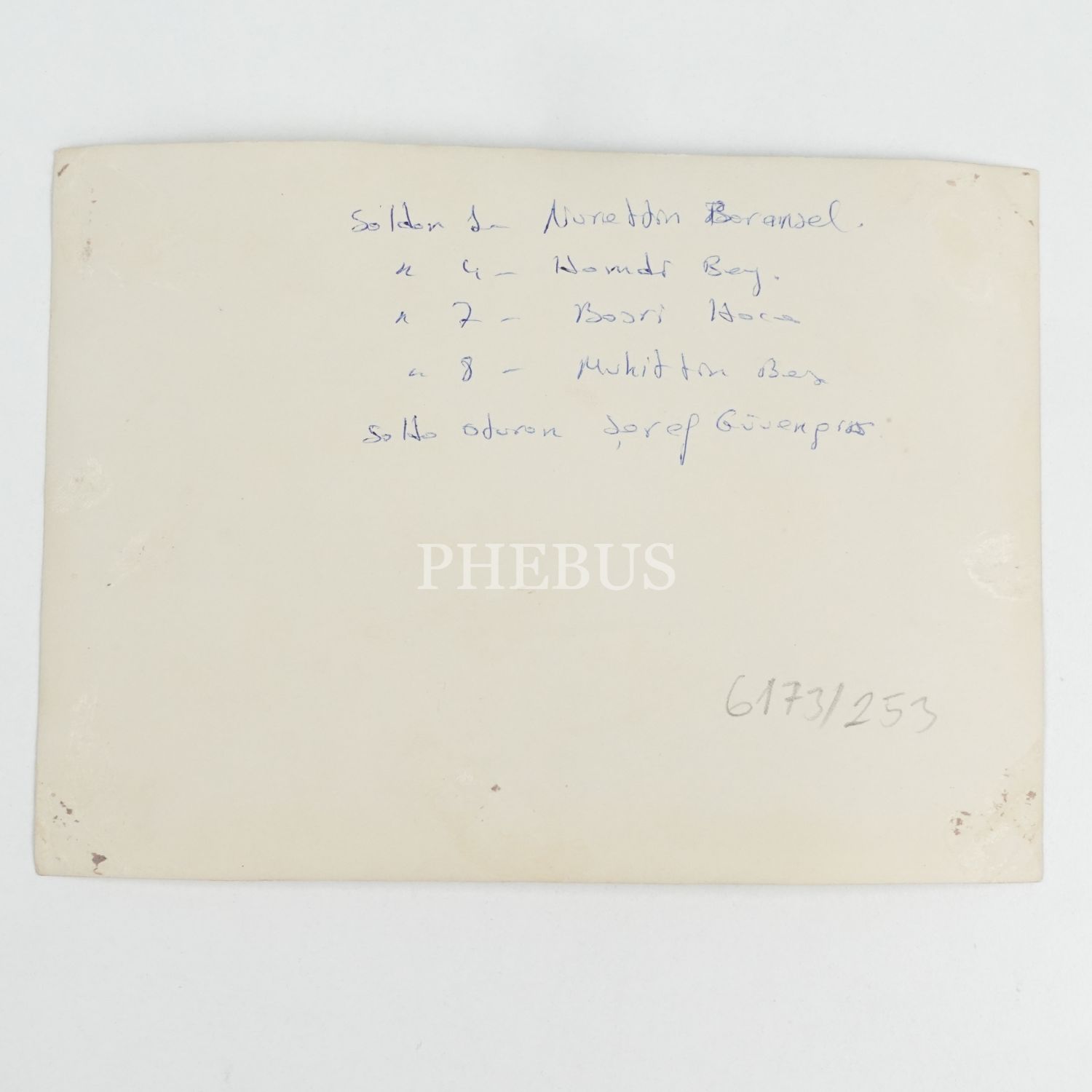 Fotoğrafın arka yüzüne yeni harflerle kadrajda yer alan tanınmış simaların isimleri not düşülmüştür.
