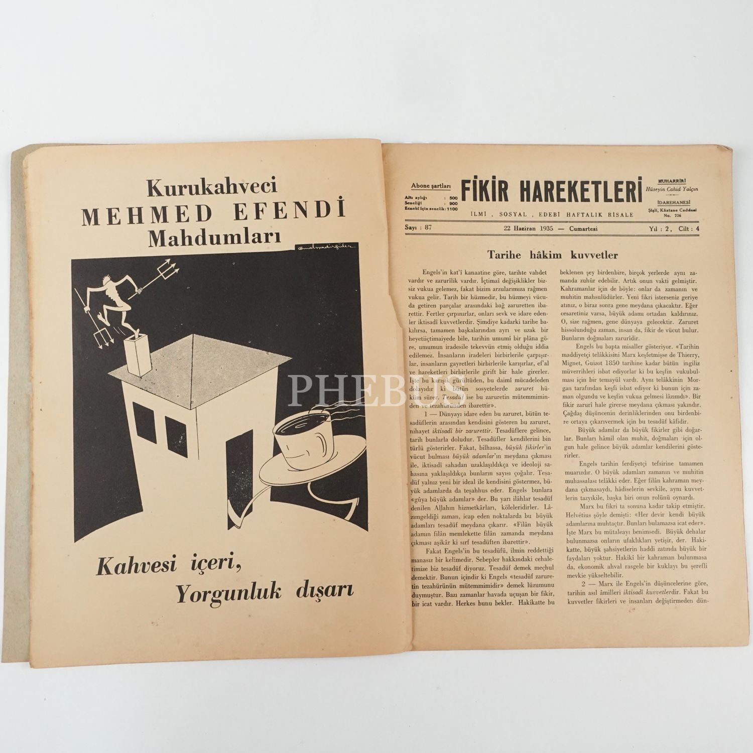 Hüseyin Cahit Yalçın tarafından çıkarılan FİKİR HAREKETLERİ dergisinin, 13 Haziran 1935 ilâ 21 Kânunuevvel (Ocak) 1935 tarihleri arasında yayımlanan 25 sayısı, 25x34 cm...