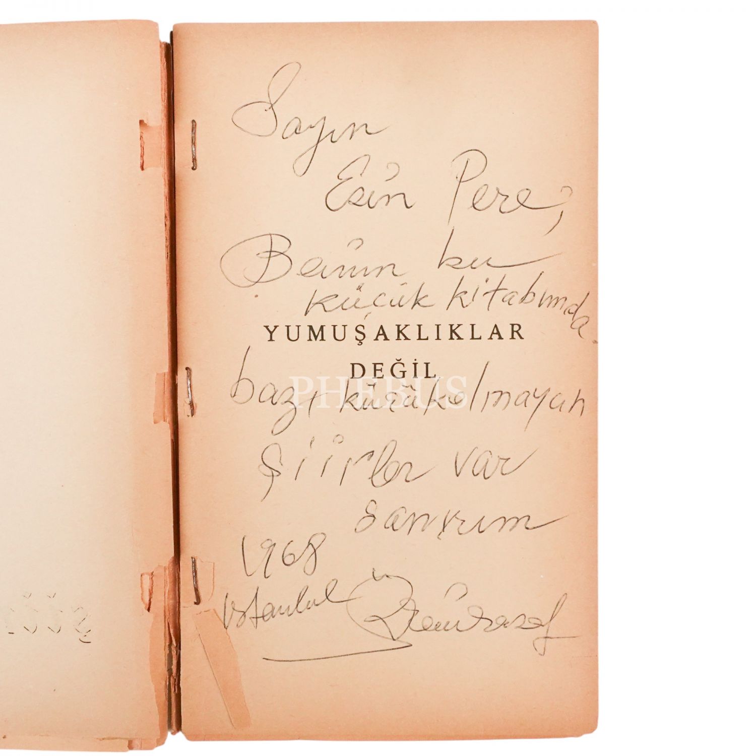 "Sayın Esin Pere; Benim bu küçük kitabımda bazı küçük olmayan şiirler var sanırım." ithafıyla, 1968 yılında imzalanmıştır. *Metin bölümü sırttan ayrılmıştır.