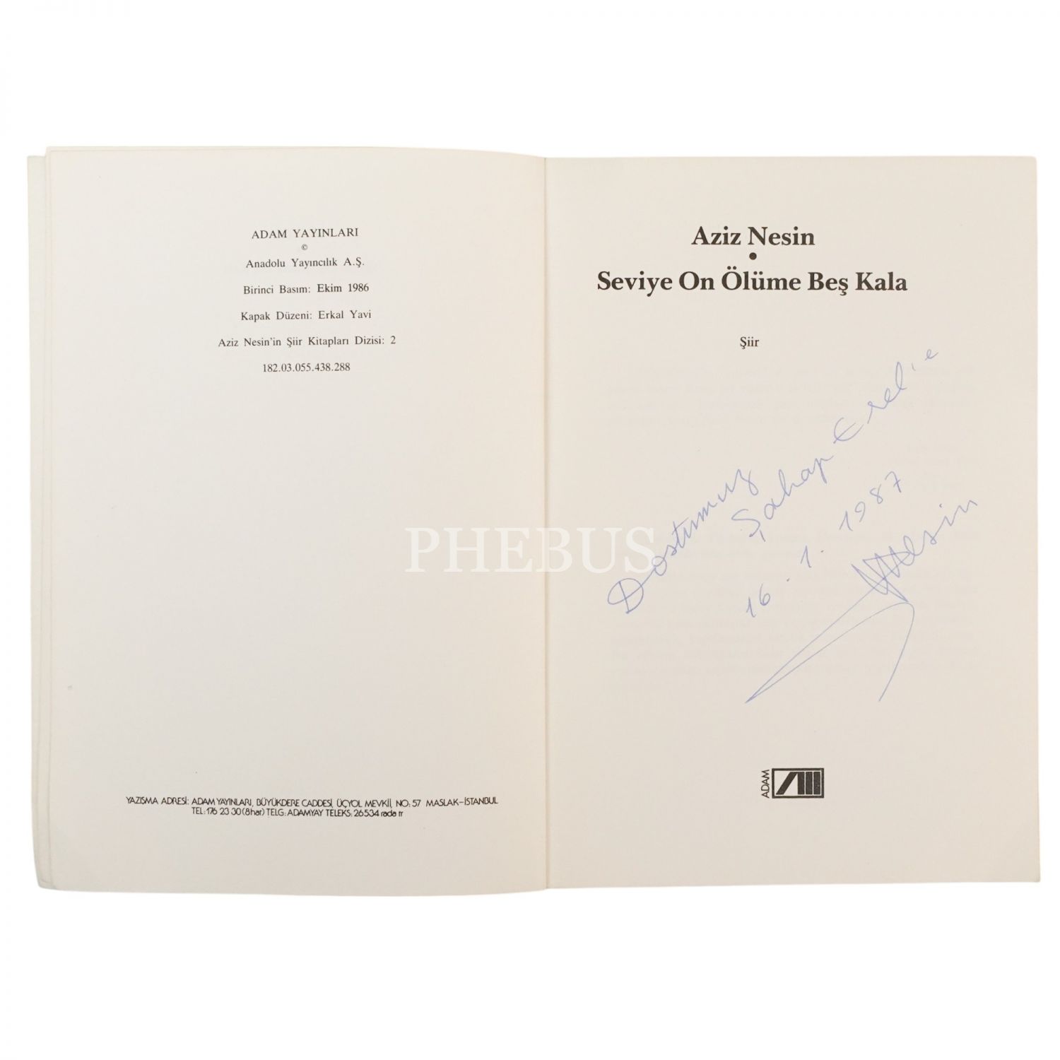 "Dostumuz Şahap Erel´e." ithafıyla, 16 Ocak 1987 tarihinde imzalanmıştır.