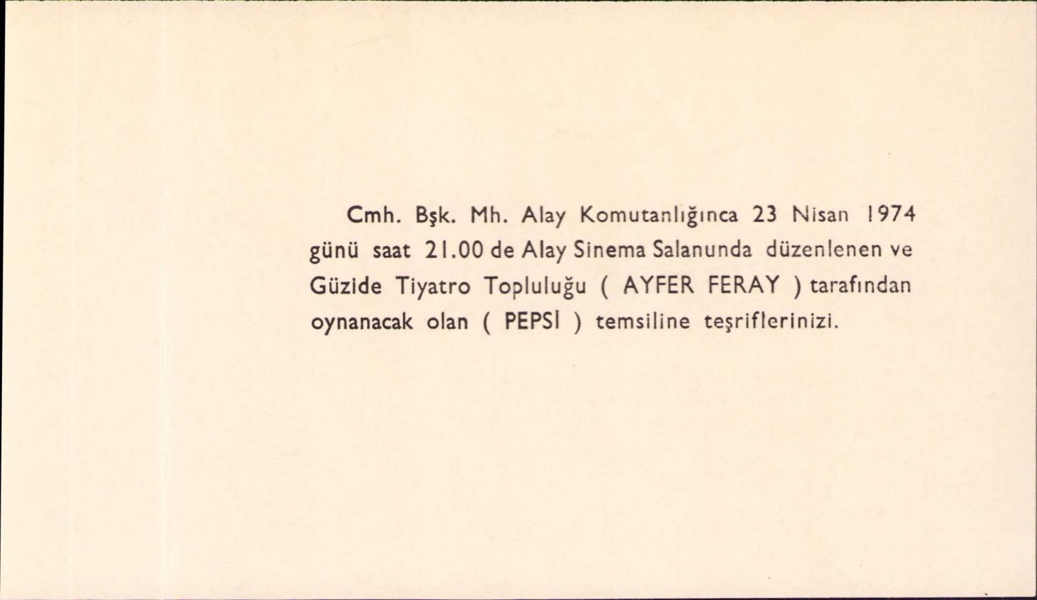 Cumhurbaşkanlığı Muhafız Alayı Komutanlığı tarafından 23 Nisan 1974 tarihine ait davetiye, 14x10 cm