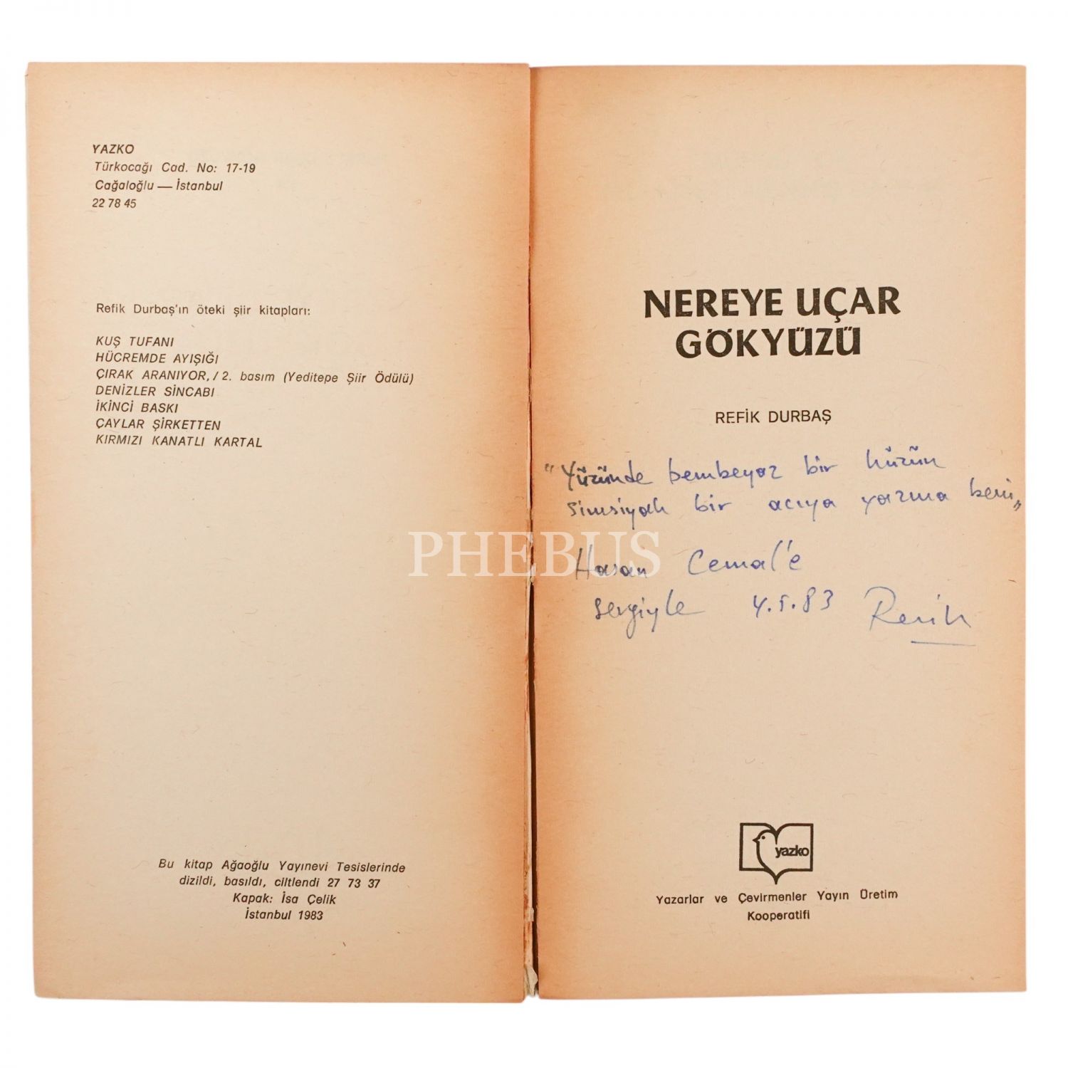 NEREYE UÇAR GÖKYÜZÜ, Refik Durbaş, 1983, YAZKO (Yazarlar ve Çevirmenler Yayın Üretim Kooperatifi), 59 sayfa, 11x20 cm...