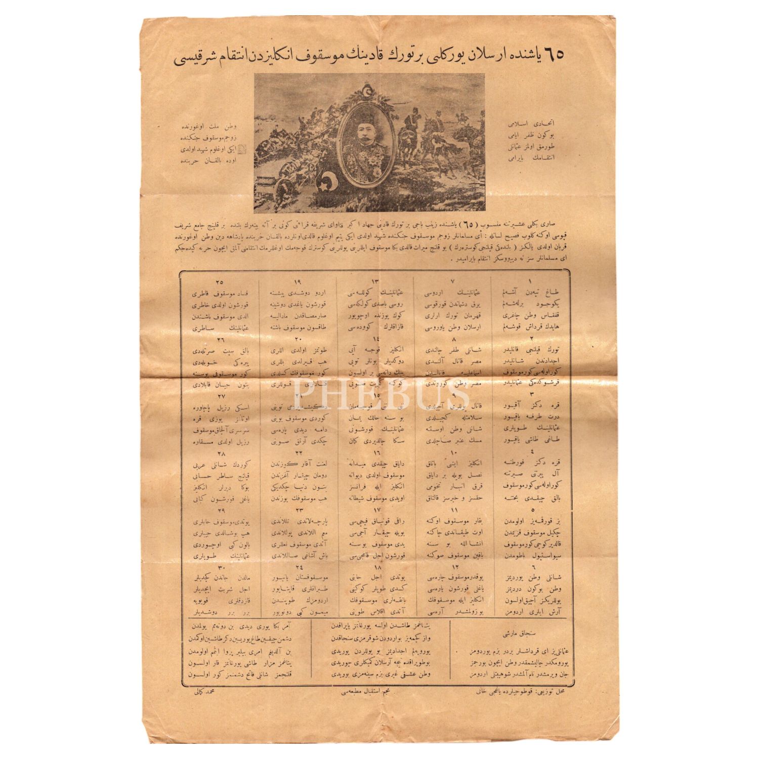 Birinci Dünya Savaşı´nı konu alan, Sultan Mehmed Reşad görselli, "65 Yaşında Arslan Yürekli Bir Türk Kadının Moskof İngiliz´den İntikam Şarkısı" başlıklı destan, Necm-i İstikbal Matbası, 29x43 cm...