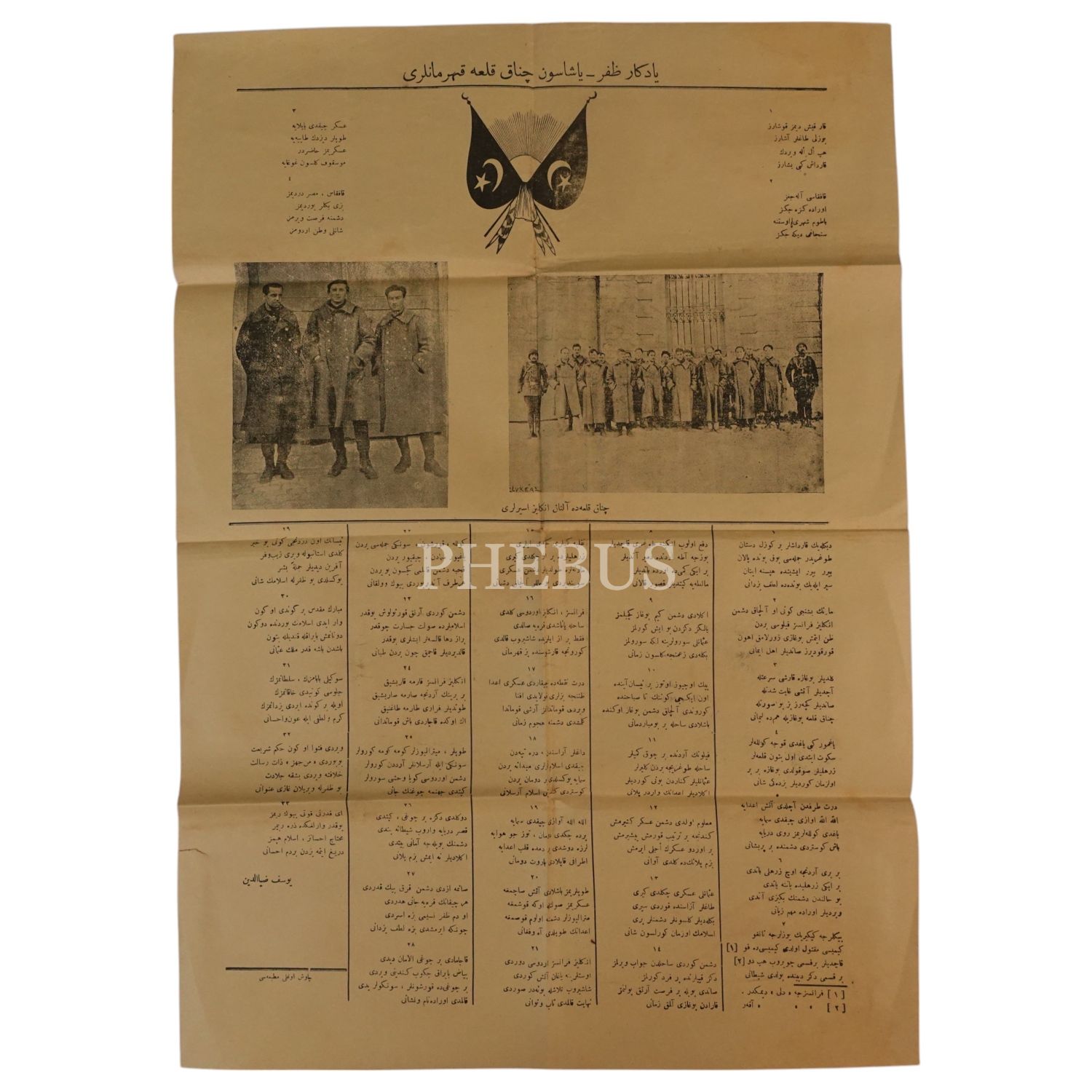 Çanakkale Savaşı´nı konu alan ve Çanakkale´de esir edilen düşman askerlerinin fotoğraflarına yer verilen "Yadigar-ı Zafer - Yaşasın Çanakkale Kahramanları" başlıklı destan, Çavuşoğlu Matbaası, 38x56 cm...