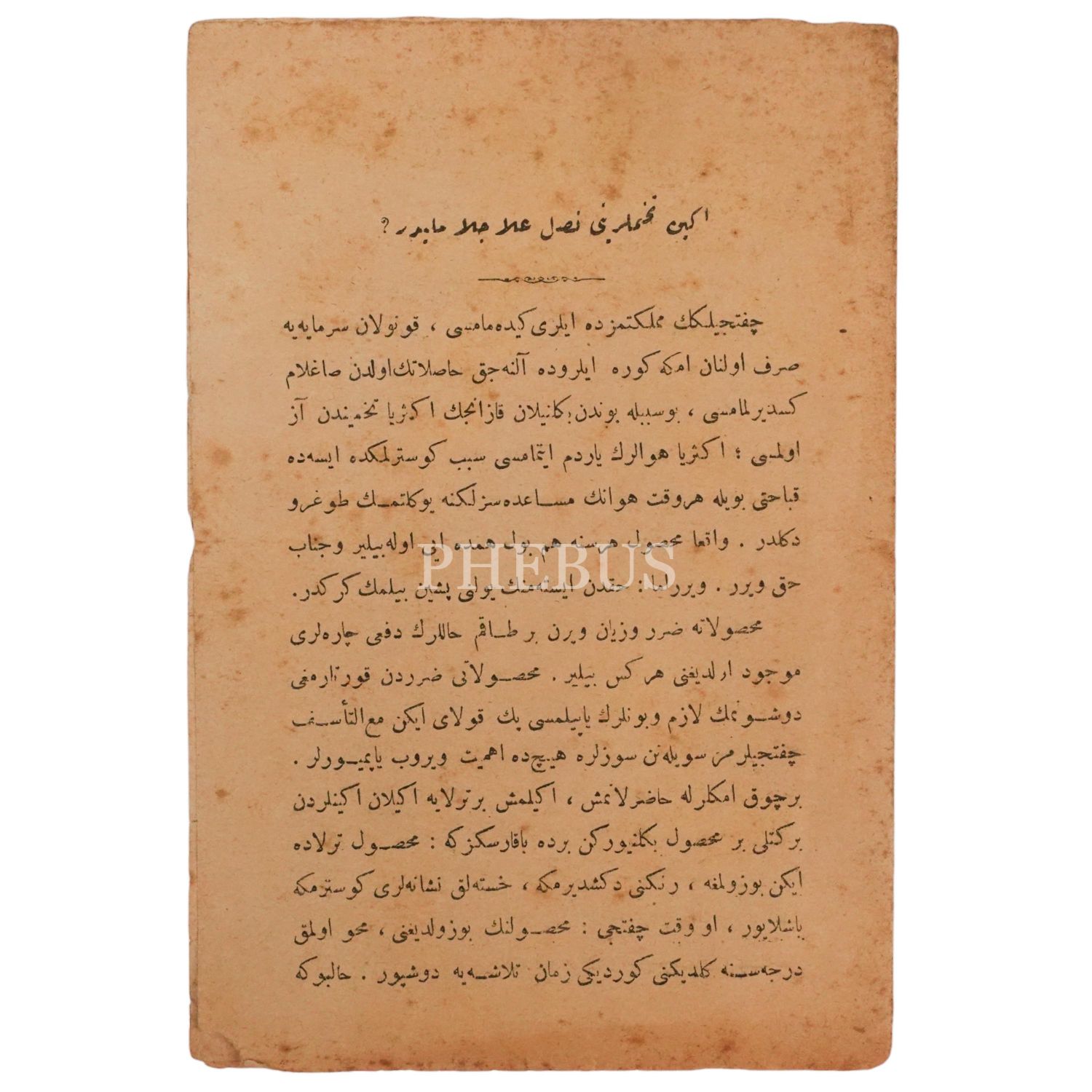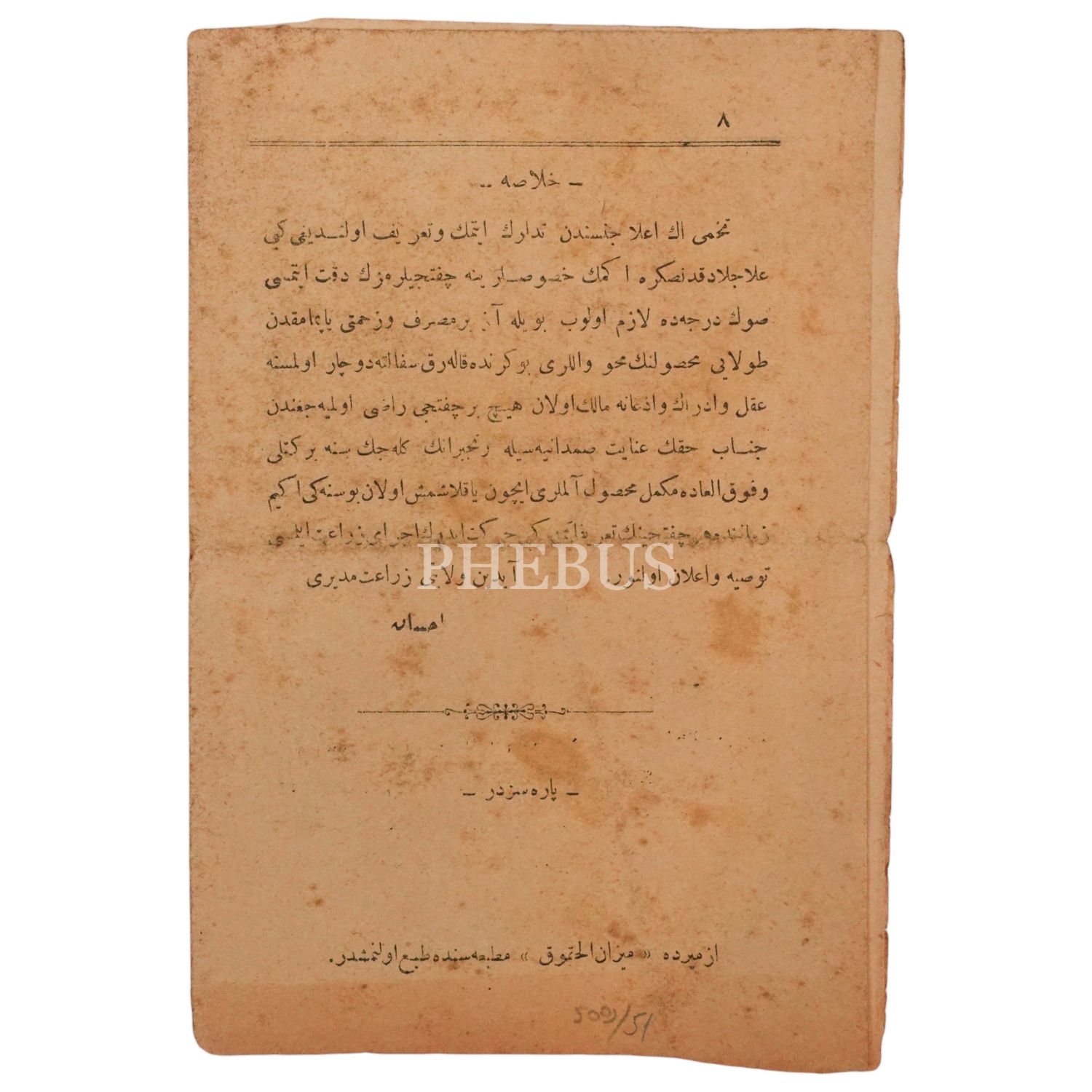 "Ekin Tohumlarını Nasıl İlaçlamalıdır?" başlıklı Aydın Vilayeti Ziraat Müdürü tarafından kaleme alınmış risale, Mizanü´l-Hukuk Matbaası, 8 sayfa, 13x19 cm...