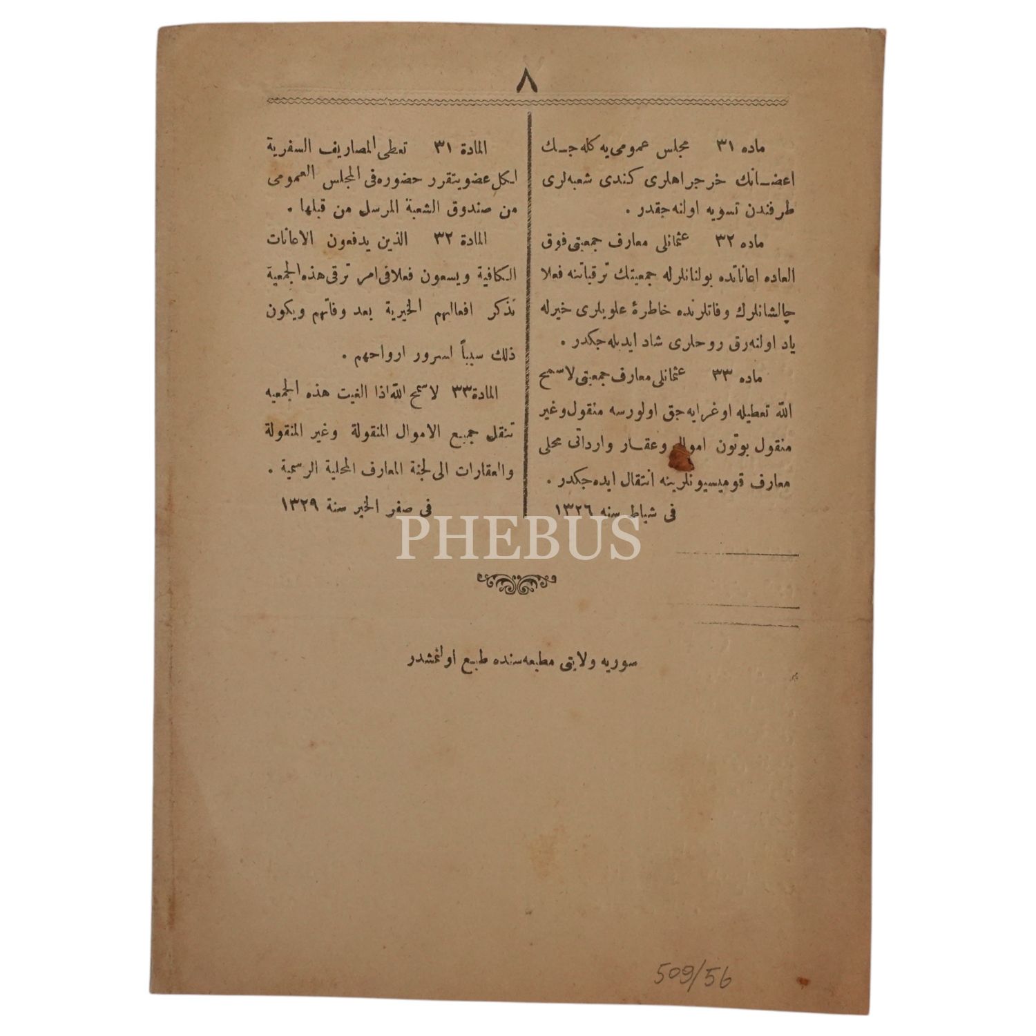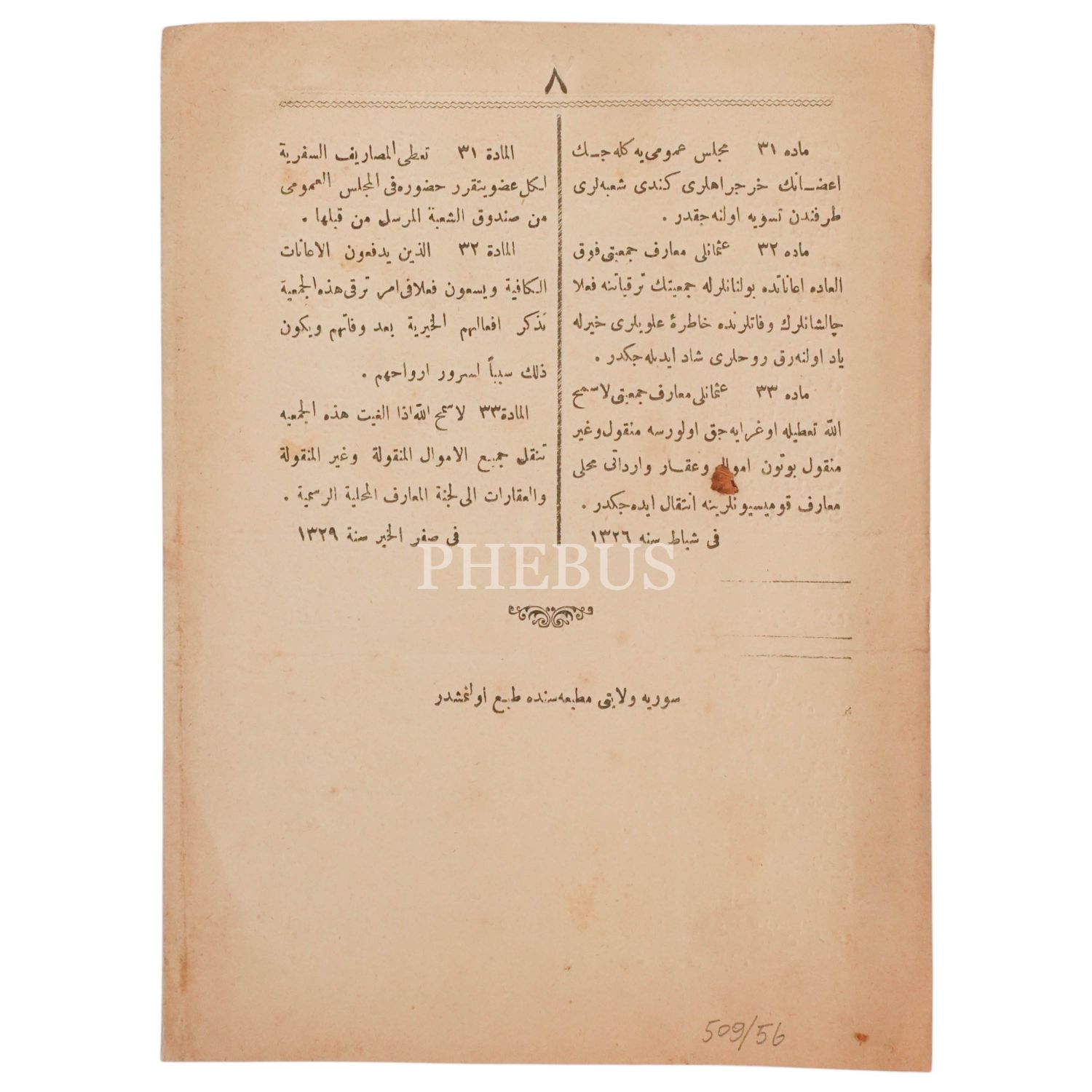 Osmanlı Maarif Cemiyeti Nizamnamesi, Suriye Vilayeti Matbaası, 8 sayfa, 16x22 cm...
