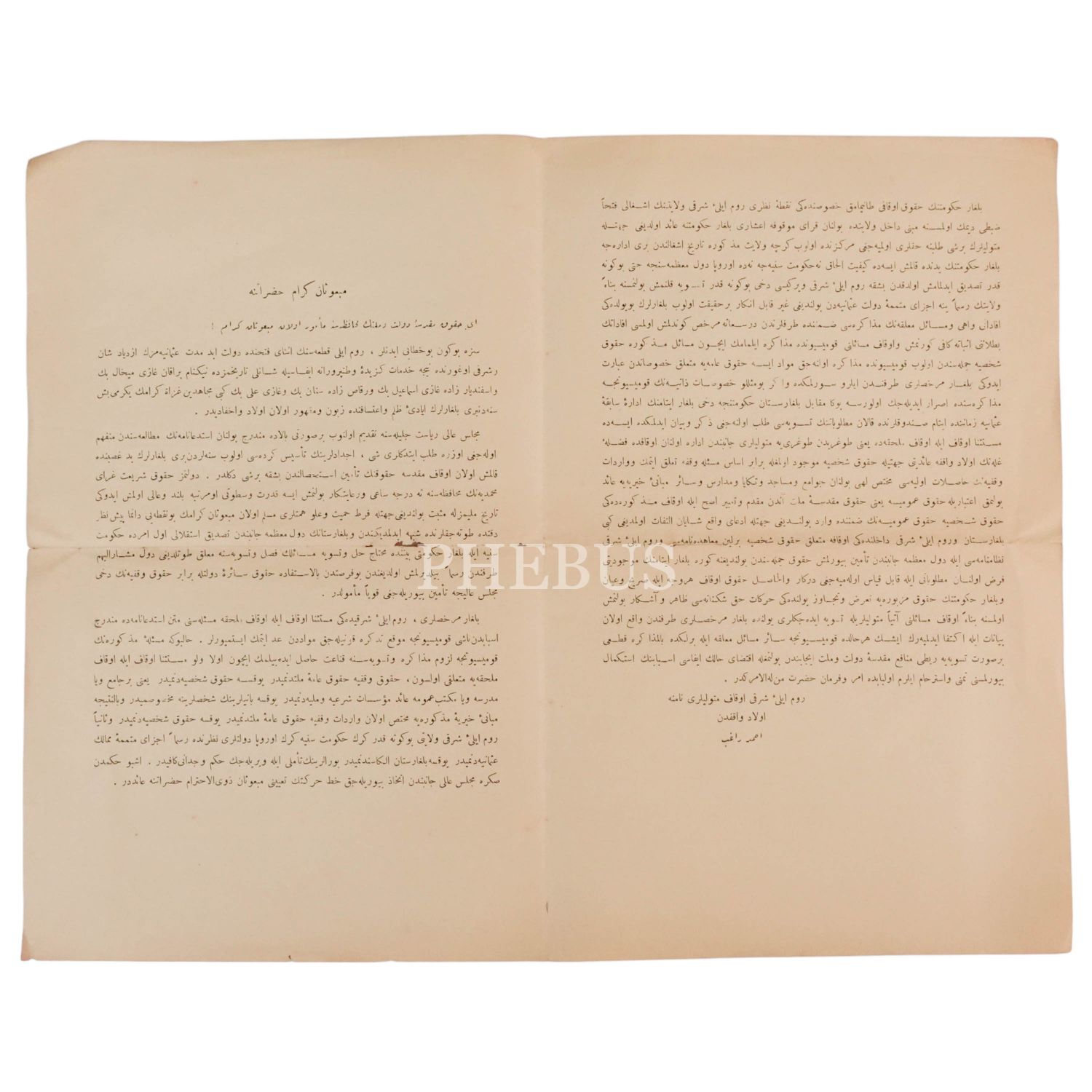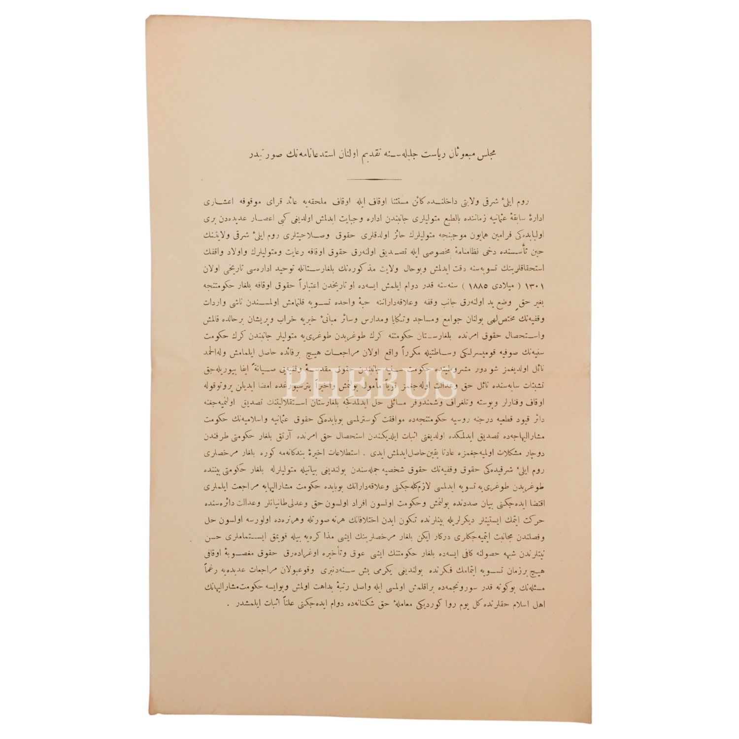 Bulgaristan sınırları dahilinde bulunan bir vakfın bakımsızlıktan dolayı perişan bir halde olduğunu ve bu vakfın bakımına dair Bulgaristan Devleti ile bir anlaşmaya varılması gerektiğine dair vakfın mütevellileri tarafından Meclis-i Mebusan´a sunulan layiha, 40x31 cm...