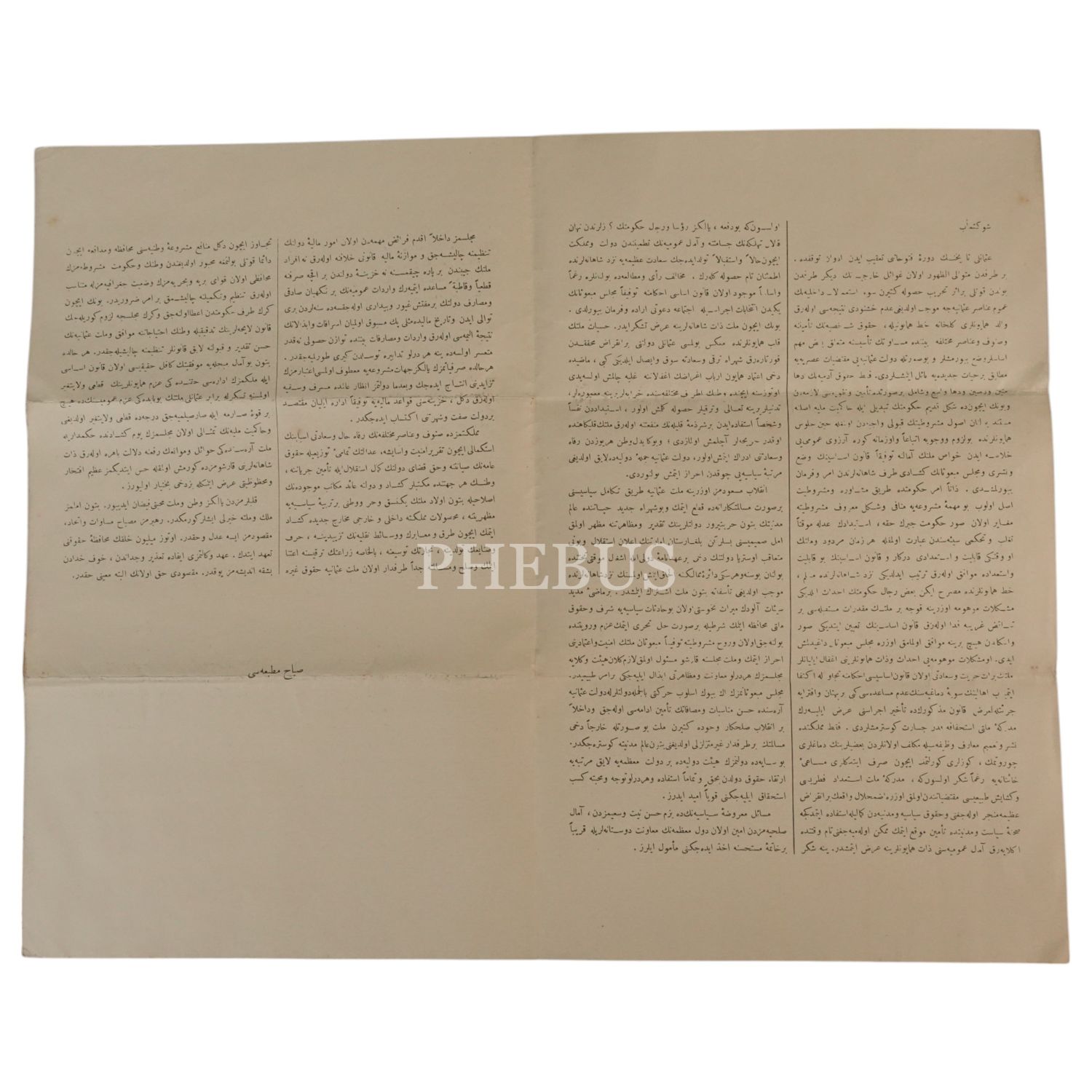 Osmanlı Devleti Hükümeti ve Meşrutî yönetimi muhafaza edebilmek, bulunduğu coğrafyada barışı muhafaza ederek halkının refahını arttırmak için kara ve denizlerde bulunan askeri kuvvetlerin güçlü tutulması gerektiğine dair kaleme alınmış ve Meclis-i Mebusan´a sunulmuş layiha, Sabah Matbaası, 46x37 cm...