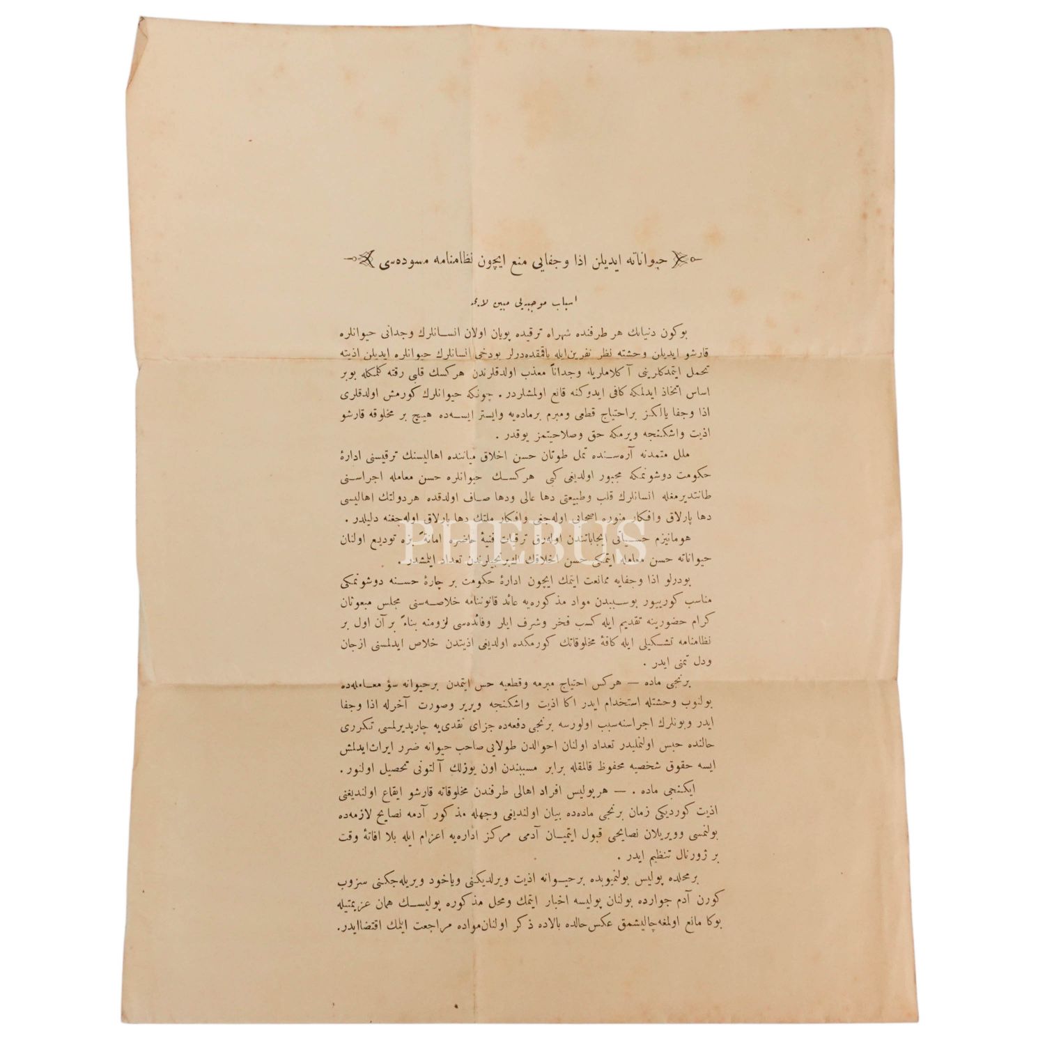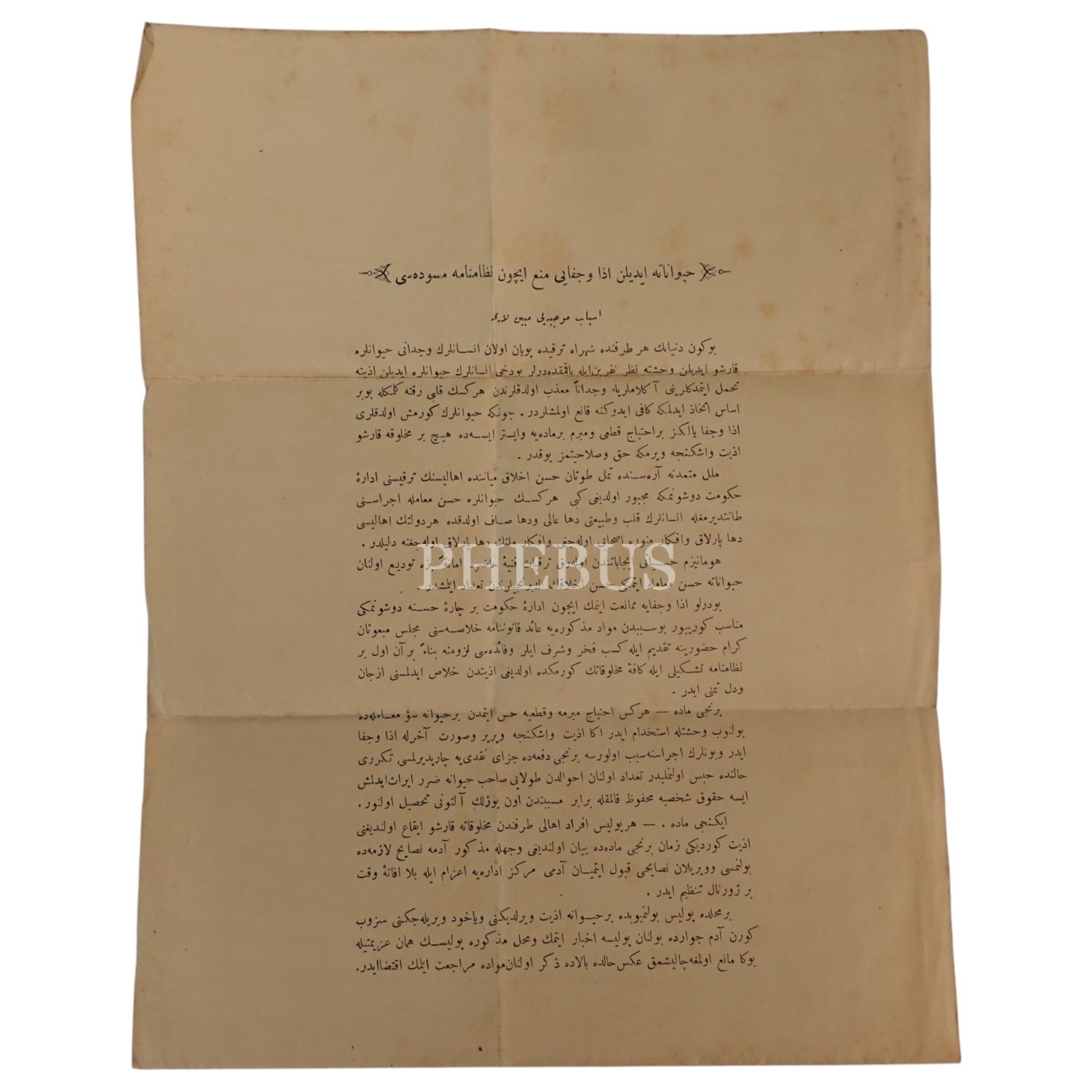 Hayvanlara eziyet edilmesine mani olunması hakkında kaleme alınmış nizamnane taslağı, "Hayvanata edilen eza ve cefaya mani´ için nizamname müsveddesi", 25x32 cm...