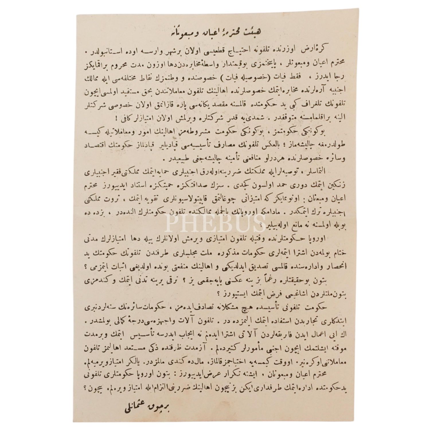 İstanbul´a telefon getirilmesi gerektiğine dair "bir çok Osmanlı" imzasıyla kaleme alınmış ve Meclis-i Mebusan´a sunulmuş dilekçe, 14x20 cm...