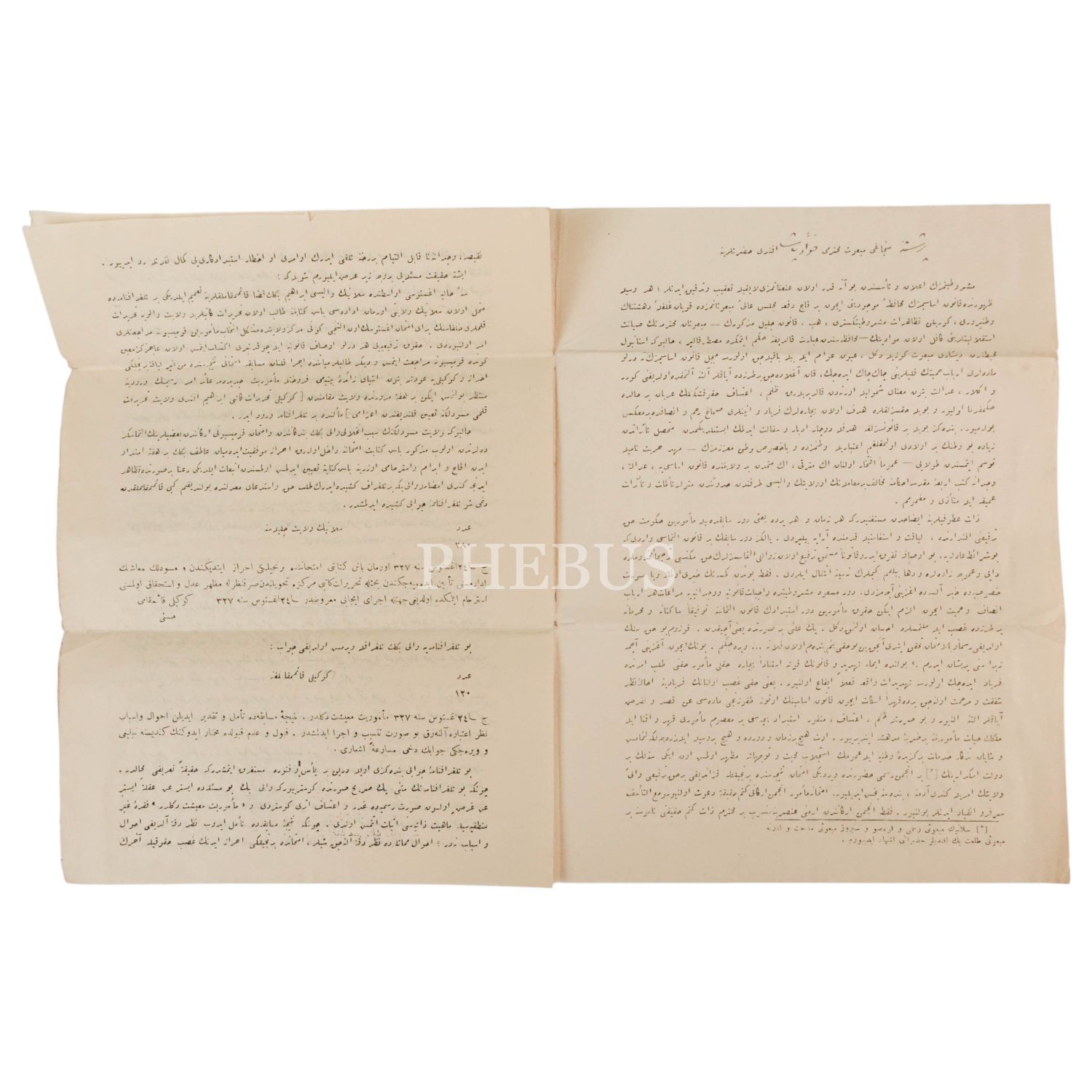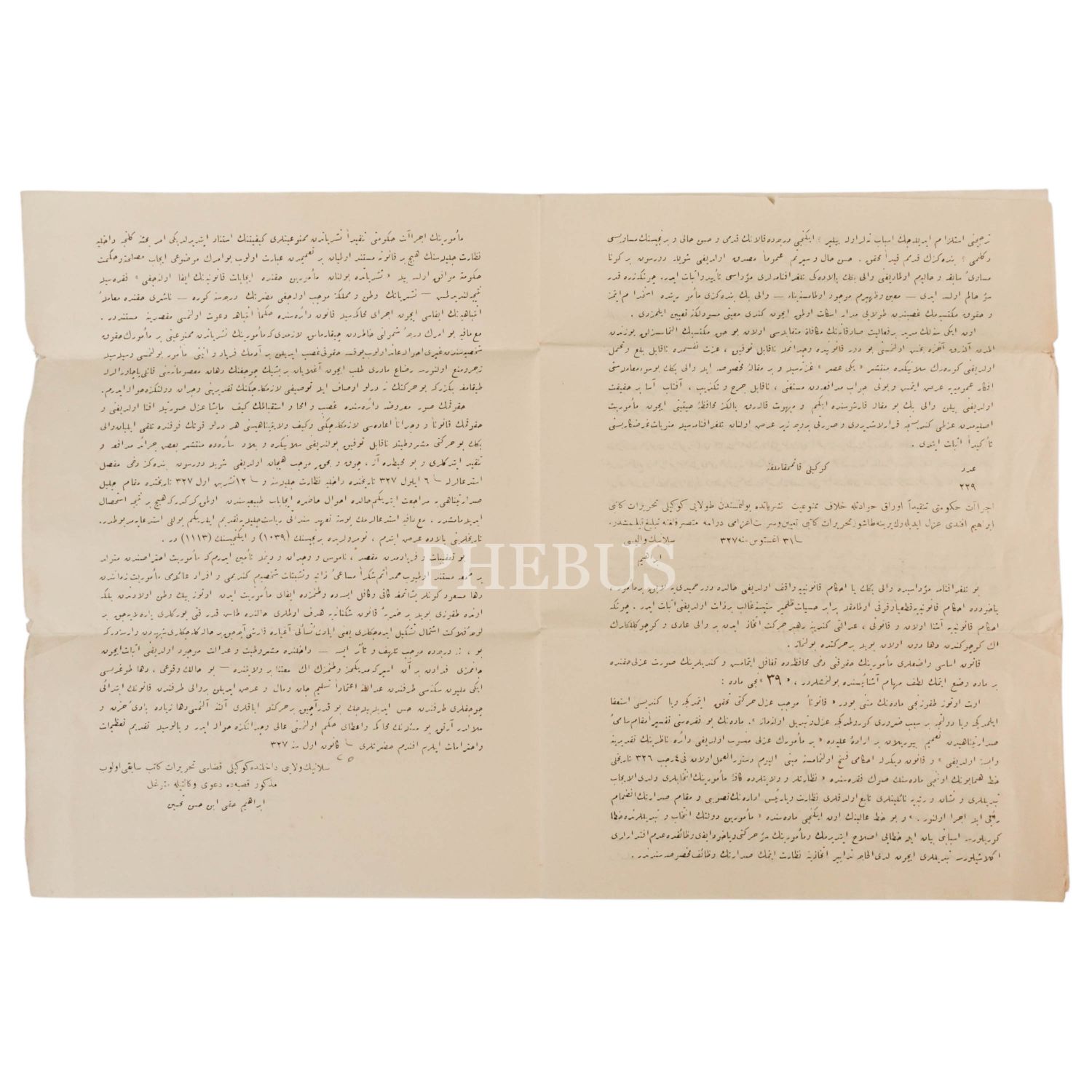 Selanik´te bulunan Gökyeli kazasının Tahrirat Katibiyken görevden alınan Hüseyin Tahsin Efendi´nin itirazını kaleme aldığı ve Priştine Sancağı Mebusu Fuad Paşa´ya sunduğu dilekçesi, 21x28 cm...