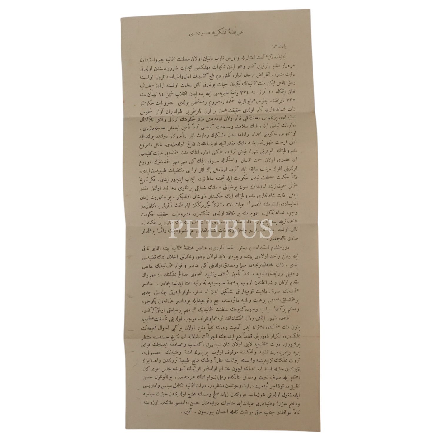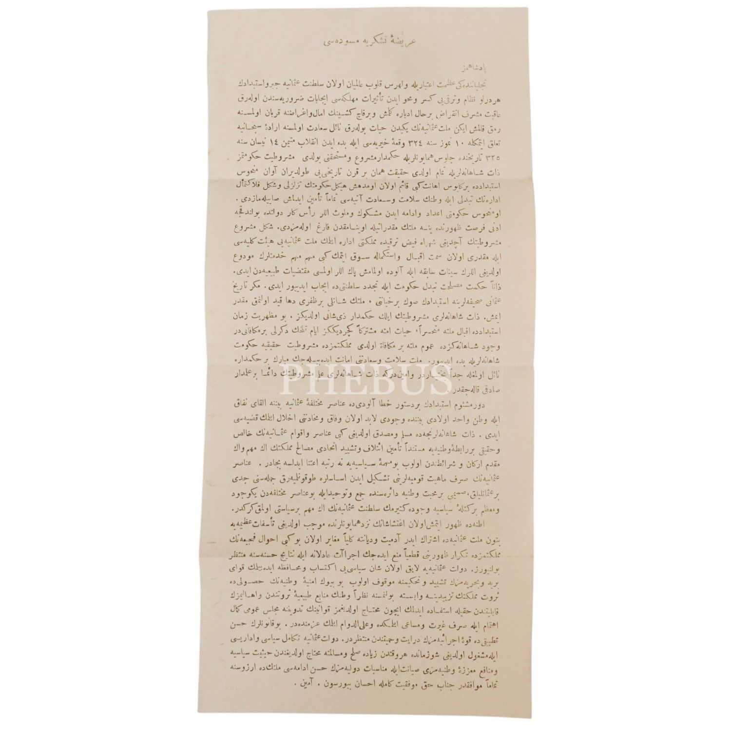Sultan Beşinci Mehmed REşad´ın 10 Temmuz 1324 (23 Temmuz 1908) tarihinde Meşrutiyet´i tekrar ilan etmesi üzerine kaleme alınmış "Arıza-yı Teşekküriye Müsveddesi" başlıklı yazı, 15x33 cm...