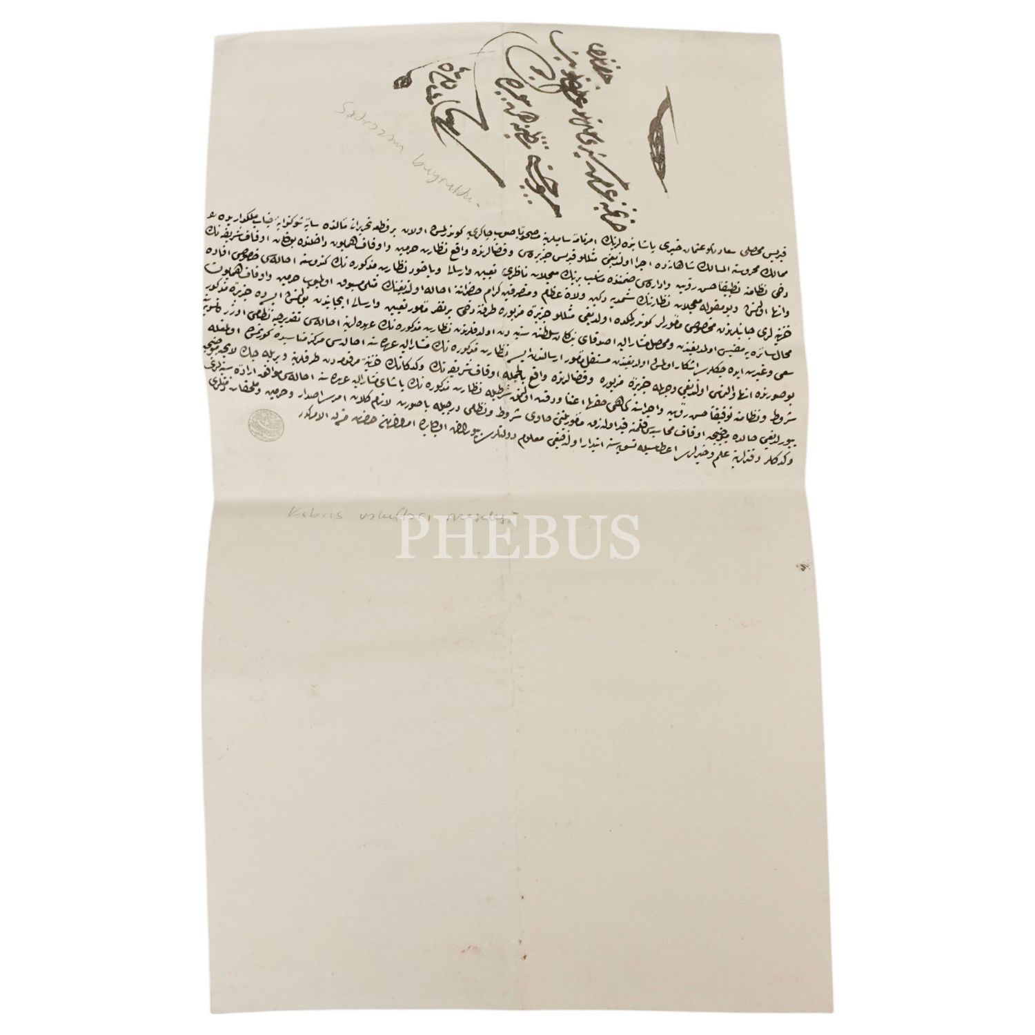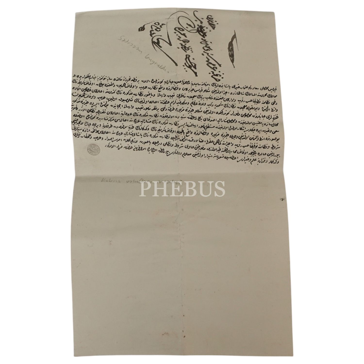 Seyyid Osman Hayri Efendi´nin Kıbrıs´ta bulunan cami ve mescitlerin bakımına dair gönderdiği arznamesine cevap olarak, mezkur vakıfların bakımlarıyla ilgilenmesi için bir muaccelat nazırının tayin edilmesini konu alan sadrazam buyruldusu, 23x39 cm...