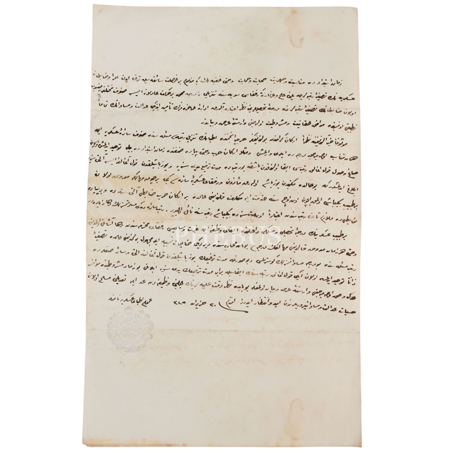Sultan İkinci Abdülhamid döneminde iltimas ve hafiyelik yoluyla terfi elde eden askerlerin rütbelerinin tenzil edilmesi hususunda, Etıbba-yı Askeriye-i Osmaniye Cemiyeti tarafından Meclis-i Mebusana sunulan layihanın el yazısıyla kaleme alınmış orijinal metni, 24x38 cm...