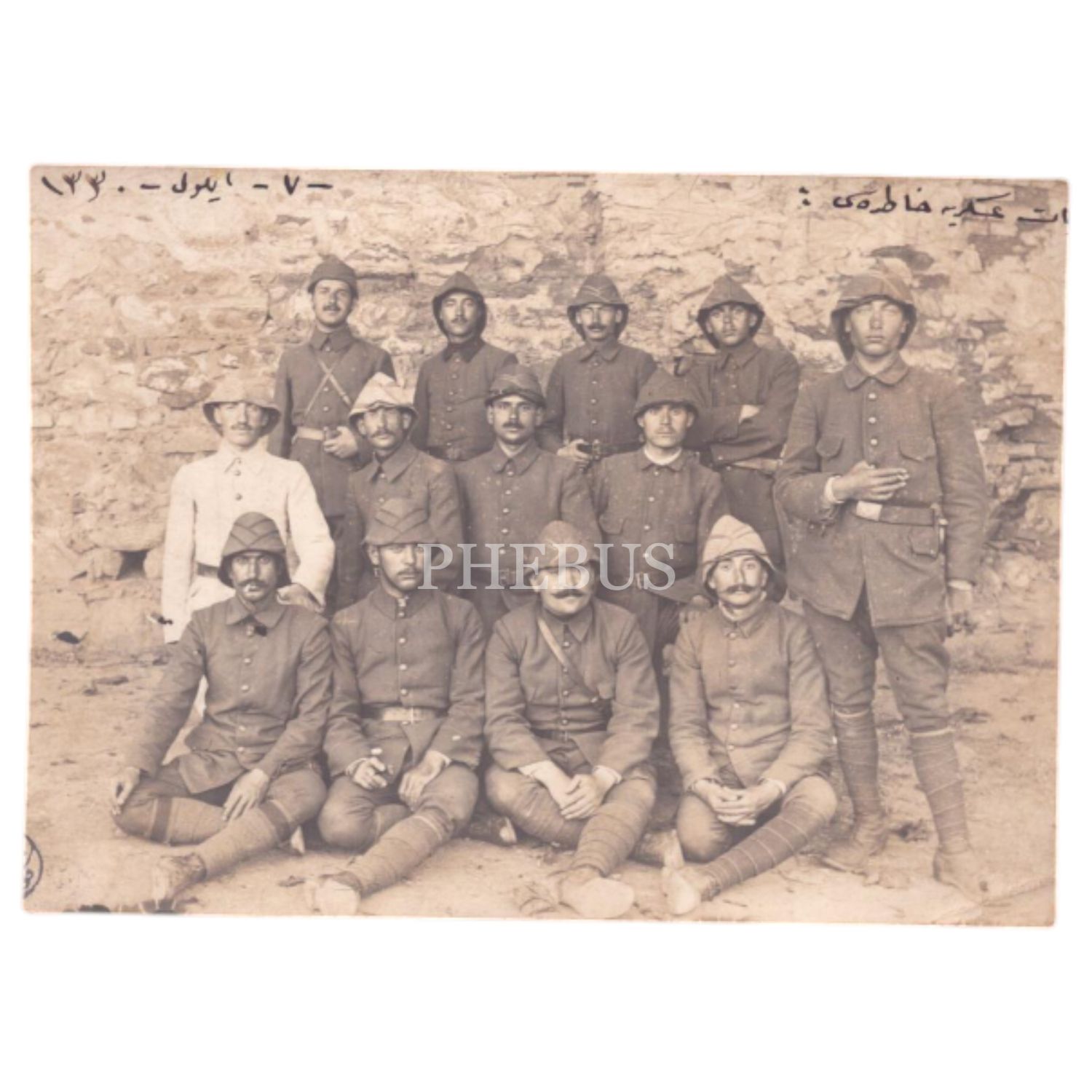 Birinci Dünya Savaşı sırasında, başlarında Enveriye şapkalarıyla kamera karşısına geçen Osmanlı askerleri, 14x9 cm...