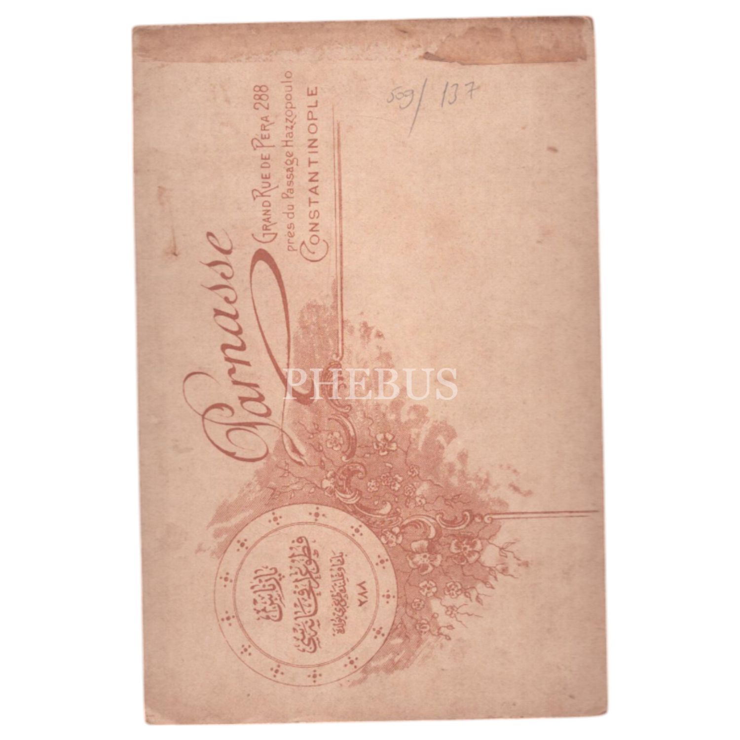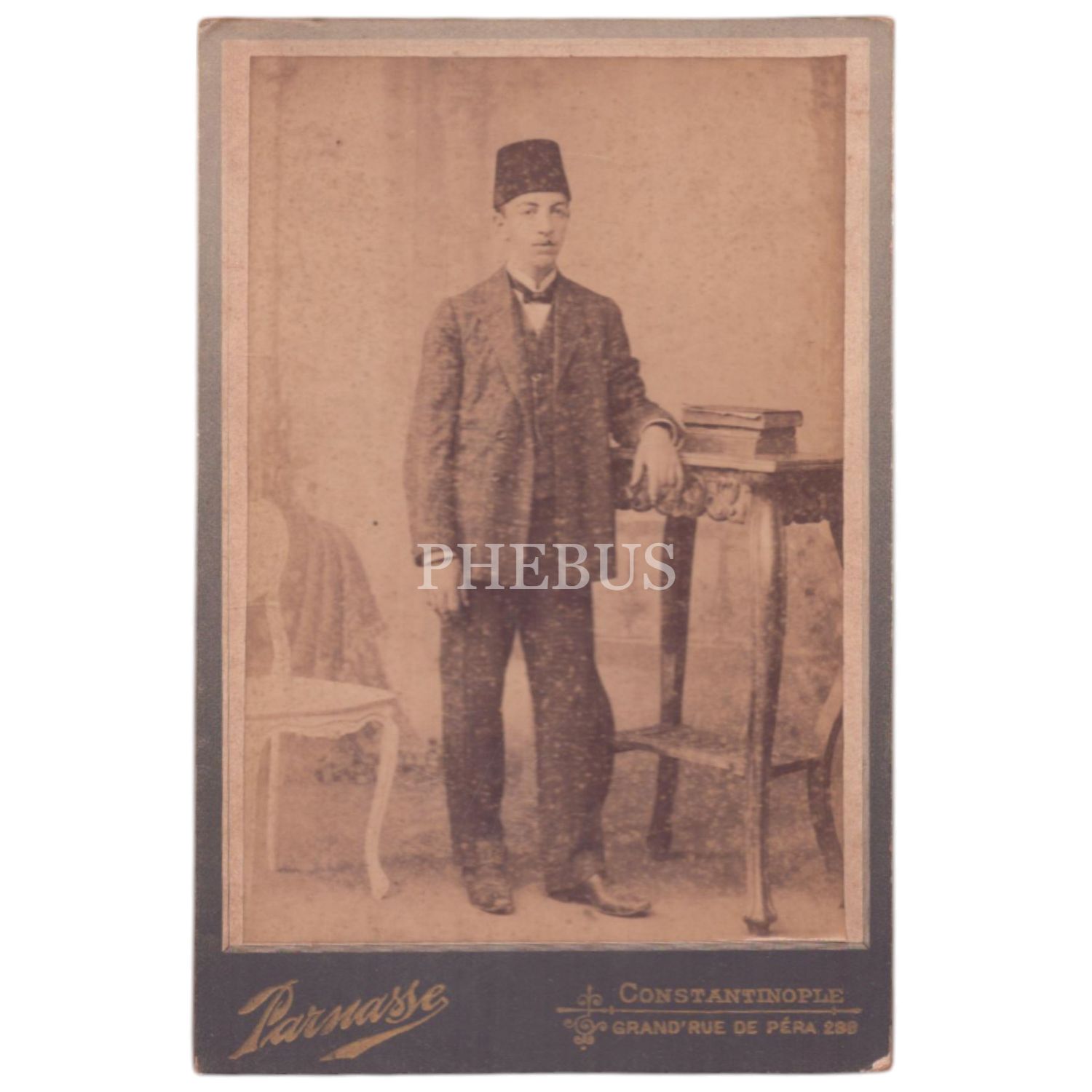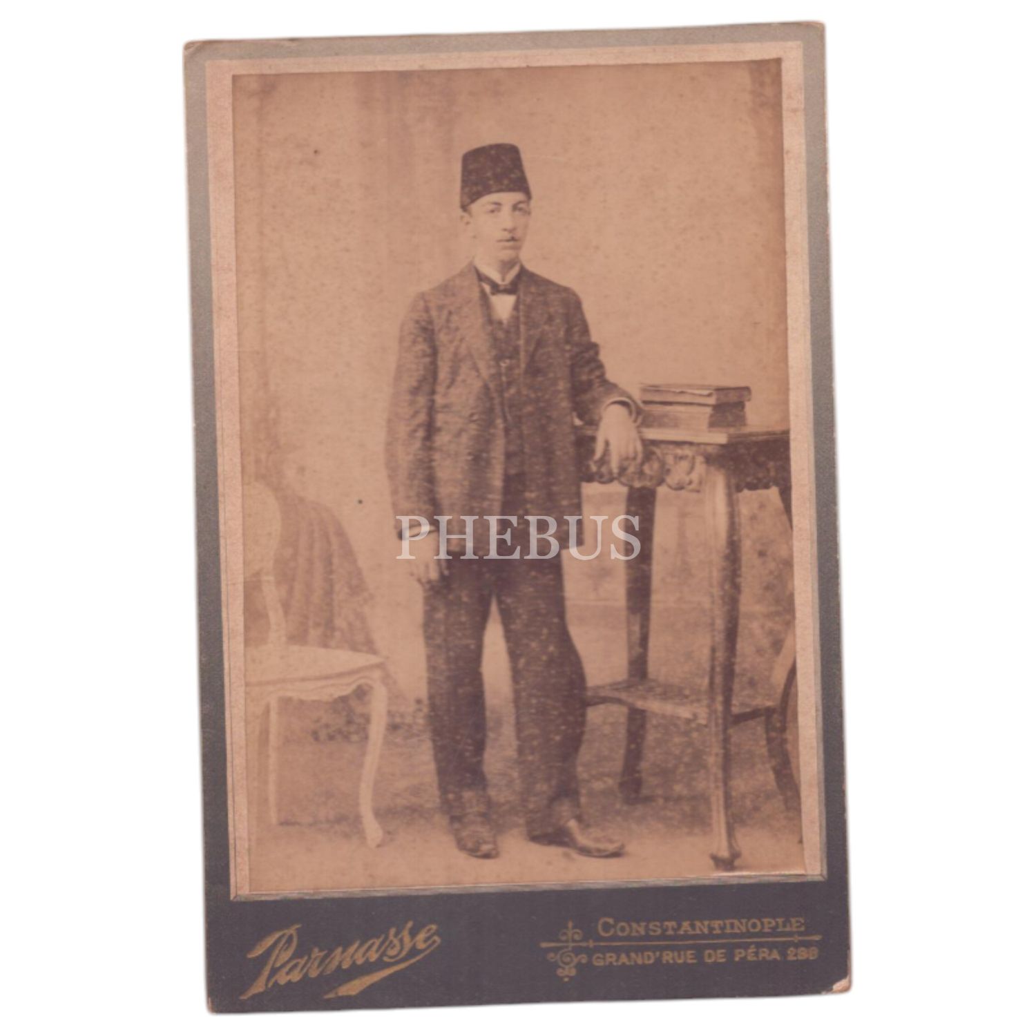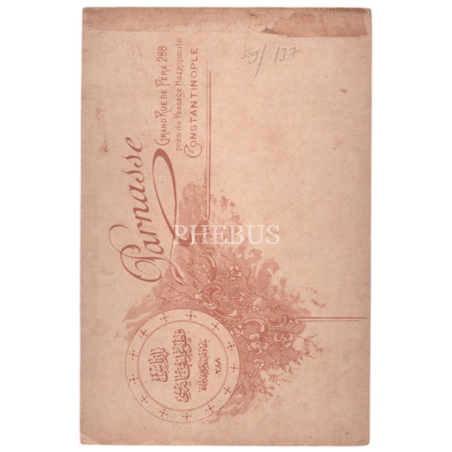 Şık giyimli bir beyefendinin stüdyo hatıra fotoğrafı, "Parnasse Fotoğrafhanesi - Constantinople", 11x17 cm...