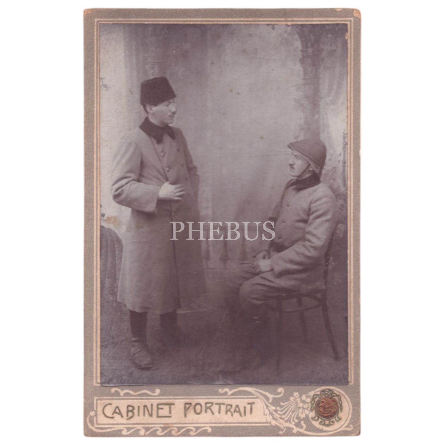 Enveri şapkalı Osmanlı askeri ve kalpaklı Osmanlı askerinin stüdyo hatıra fotoğrafı, 11x17 cm...