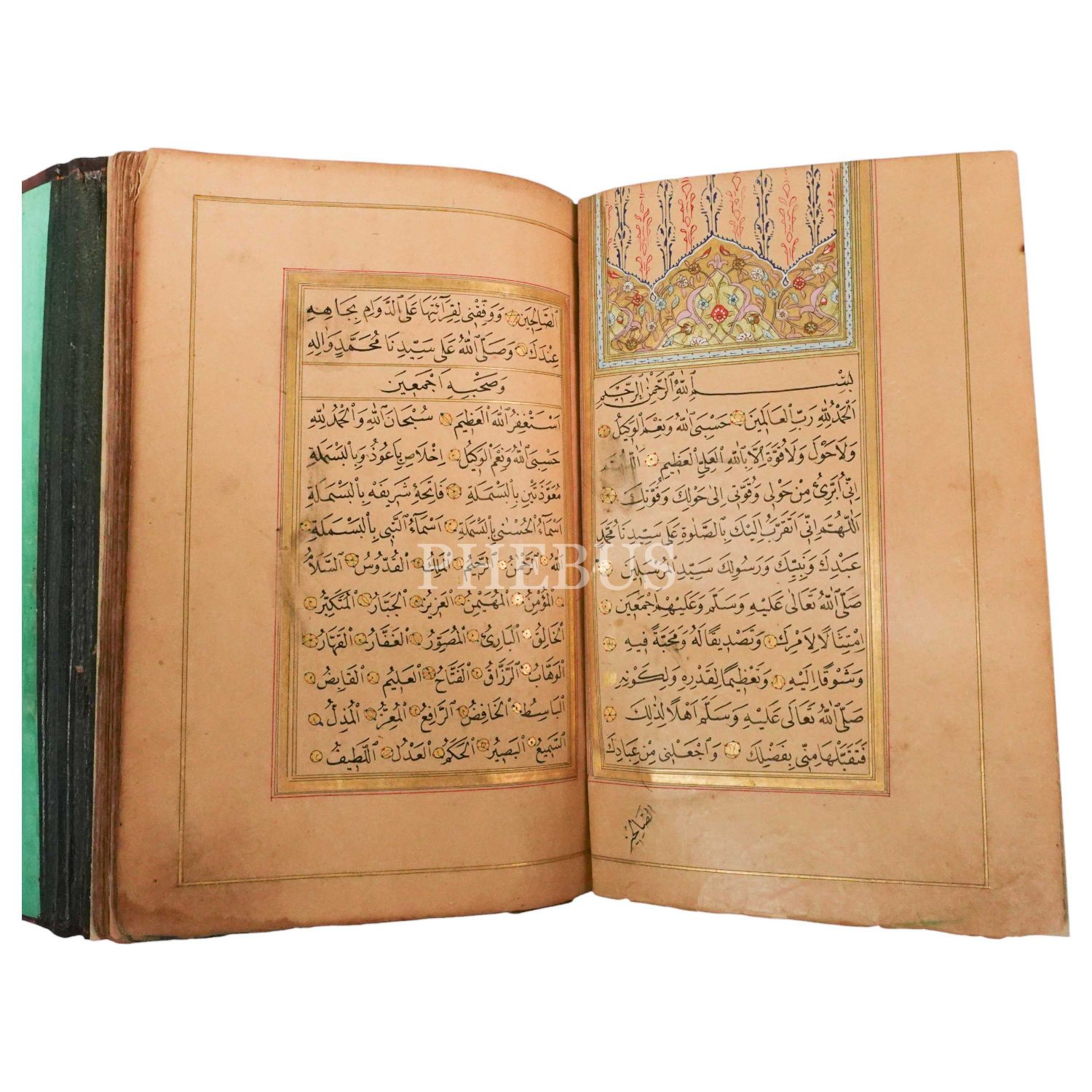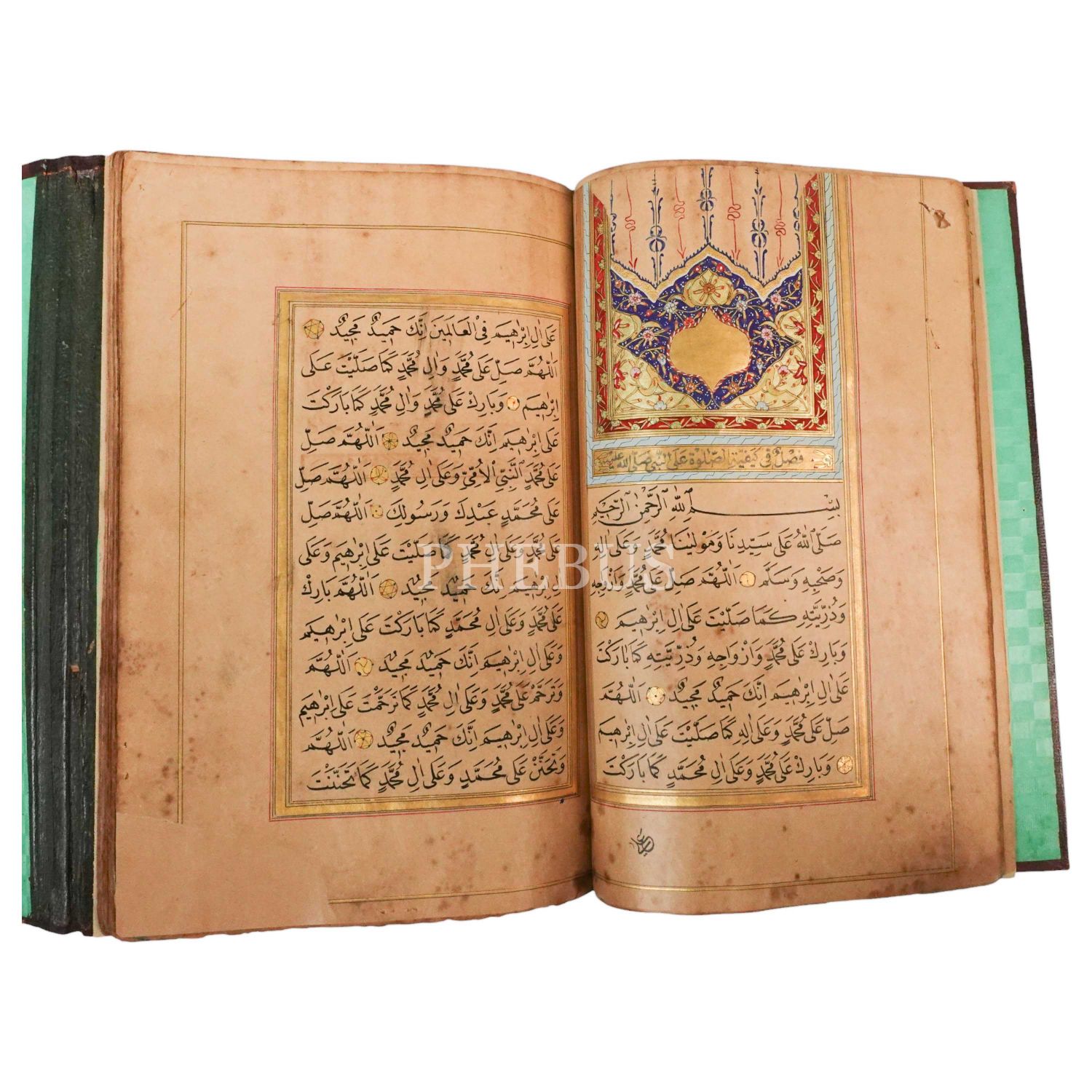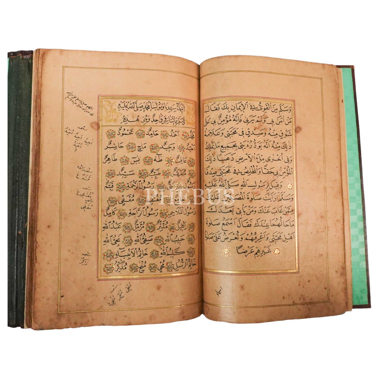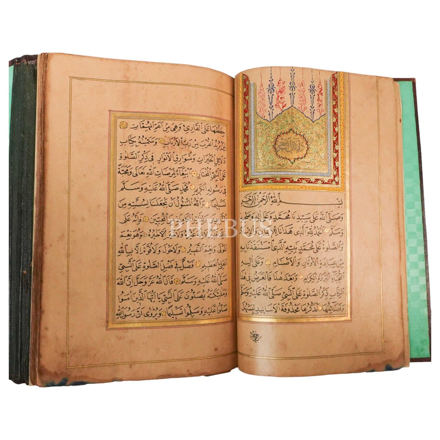 Üç adet serlevha sayfalı, tüm sayfaları iki sıra altın cetvelli ve altın duraklı, Mekke-Medine minyatürlü, kısım başları altın levhalı, Esmâ-i Nebi faslında durakların içi gubari yazı ile salavat yazılı, miklepli deri dönem cildi içinde gayet güzel bir nüshadır.