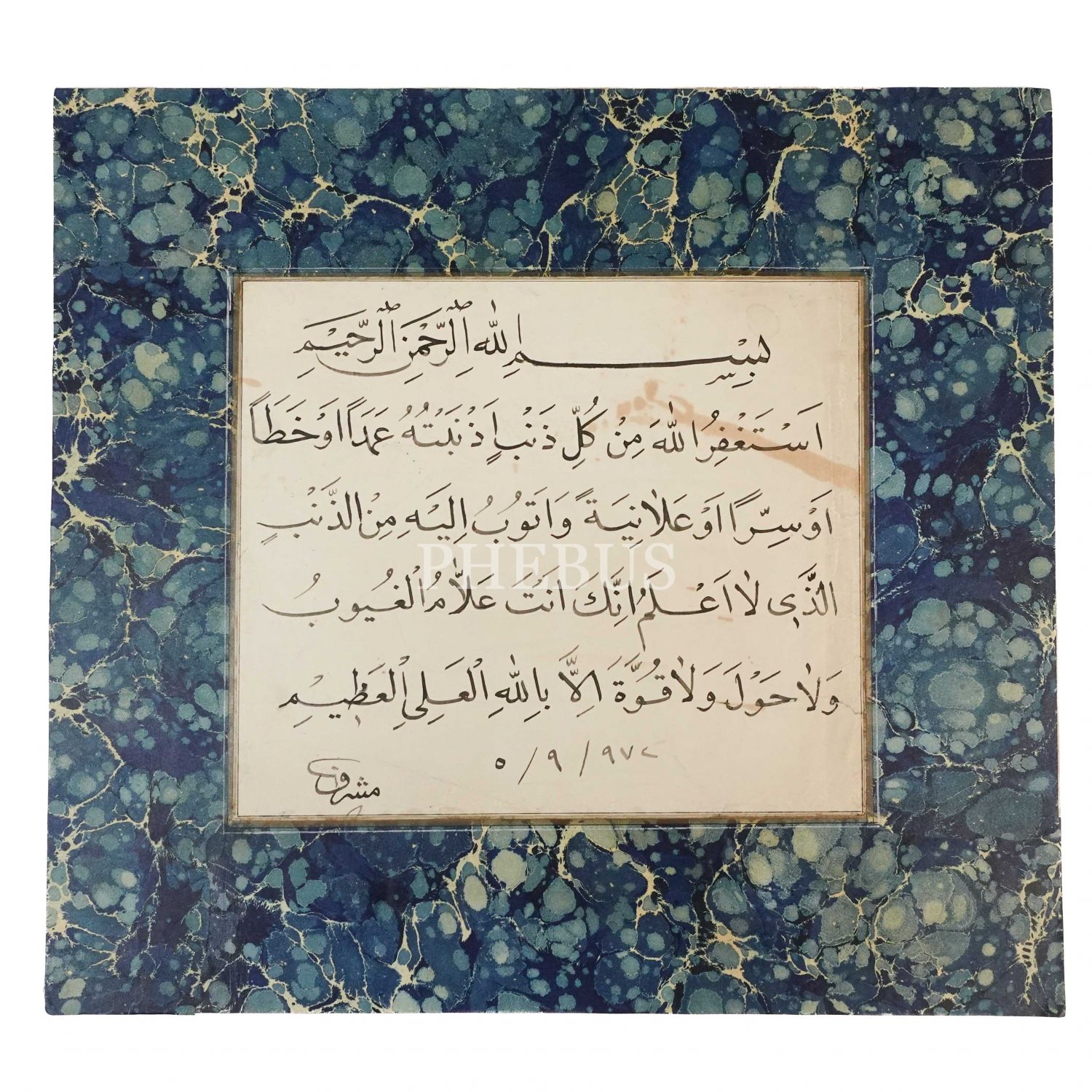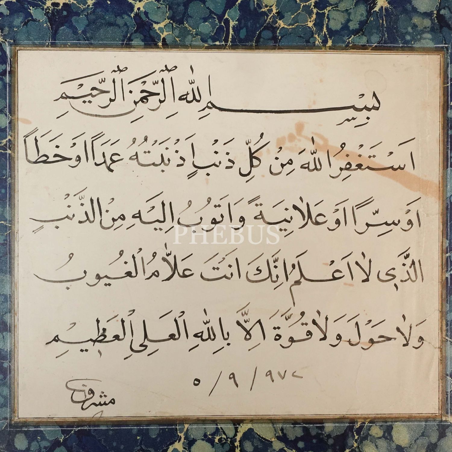 Müşerref Çelebi ketebeli nesih istiğfar yazısı, 1972 tarihli, 33x31 cm...