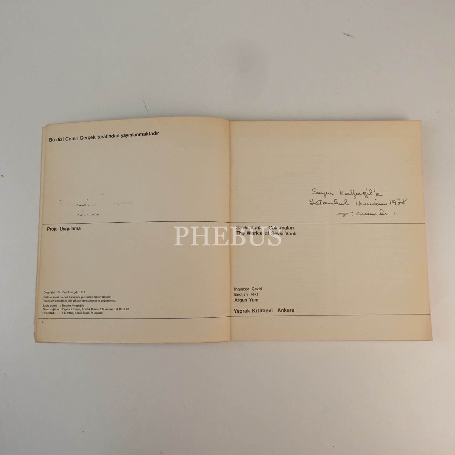"Sayın Kalfagil´e." ithafıyla, 16 Nisan 1978 tarihinde imzalanmıştır. Kitabın, ünlü fotoğrafçılarımızdan Sabit Kalfagil´e imzalandığı kanaatindeyiz.