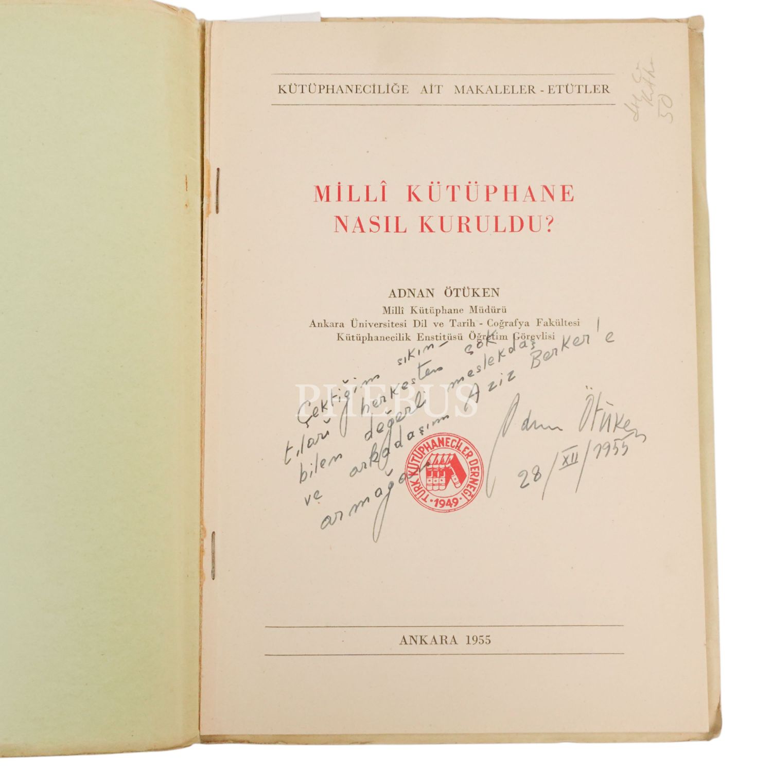 "Çektiğim sıkıntıları herkesten çok bilen değerli meslekdaş ve arkadaşım Aziz Berker´e armağan." ithafıyla, 28 Aralık 1955 tarihinde imzalanmıştır. "Türk Kütüphaneciler Derneği Bülteninin IV. Cilt, 1. Sayısından ayrı basım olarak Türk Tarih Kurumu Basımevinde 200 nüsha basılmıştır."