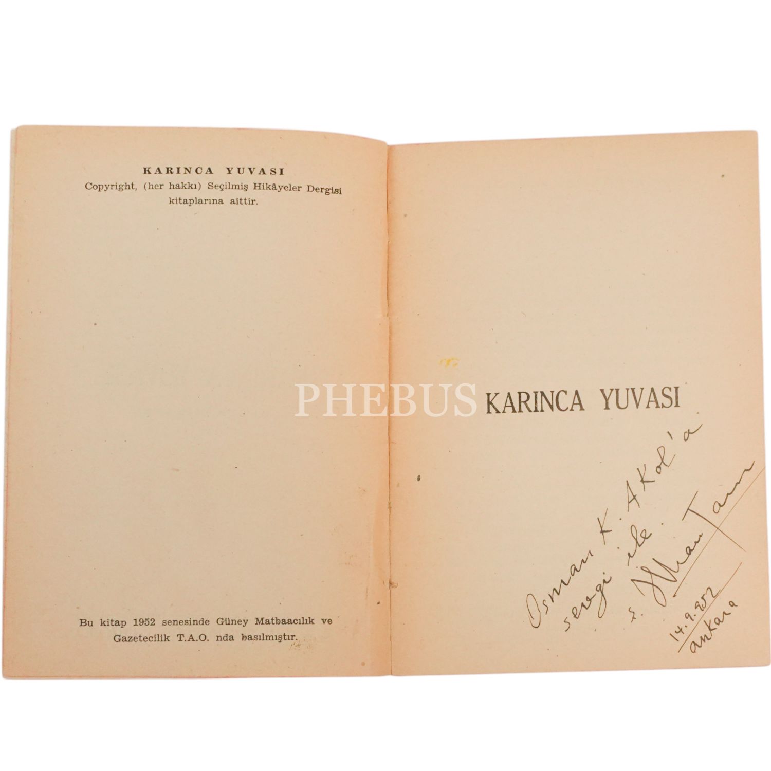 "Osman K. Akol´a sevgi ile." ithafıyla, 14 Eylül 1952 tarihinde imzalanmıştır. Kapak resmi: Turgut Atalay