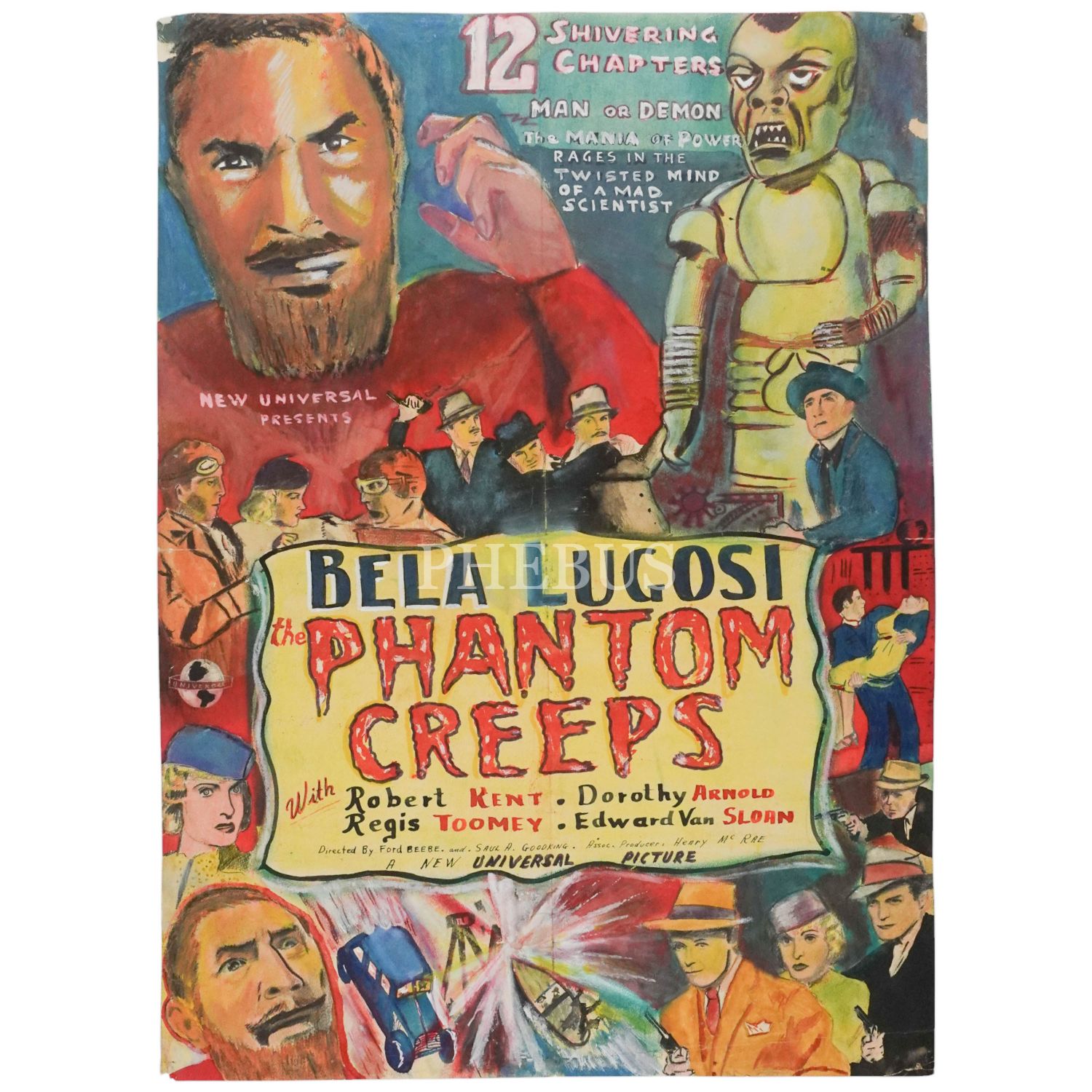 Bela Lugosi'nin, dünyayı ele geçirmeye çalışan çılgın dâhi Dr. Zorka rolünde oynadığı, 1939 yapımı, 12 bölümlük dizinin afişinin, guaj boya ve kolaj tekniğiyle yapılmış orijinali...
