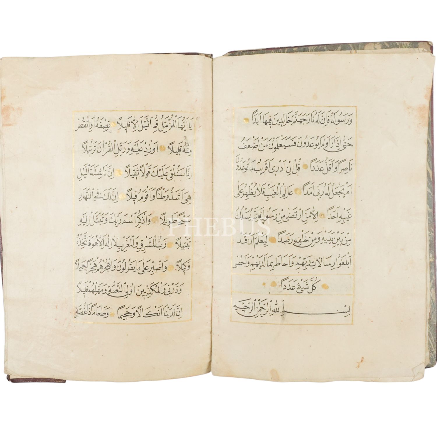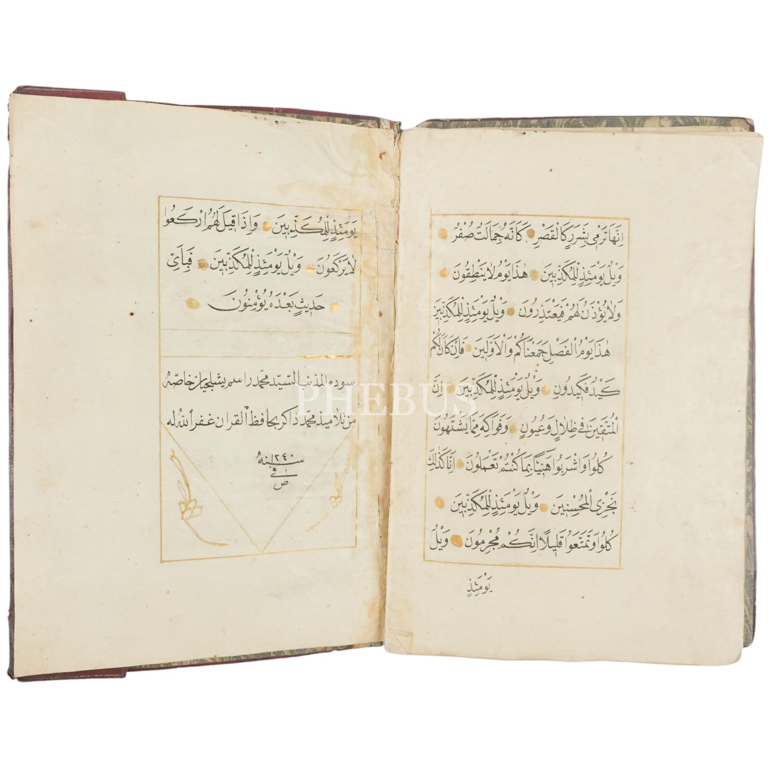 Elyazma Tebâreke Cüzü, ketebe: Şalcıyân-ı Hâssa´dan Seyyid Mehmed Rasim Efendi, hocası: Hafız Mehmed Zakir, 1240 tarihli, 40 sayfa, deri dönem cildinde, 25x16 cm...