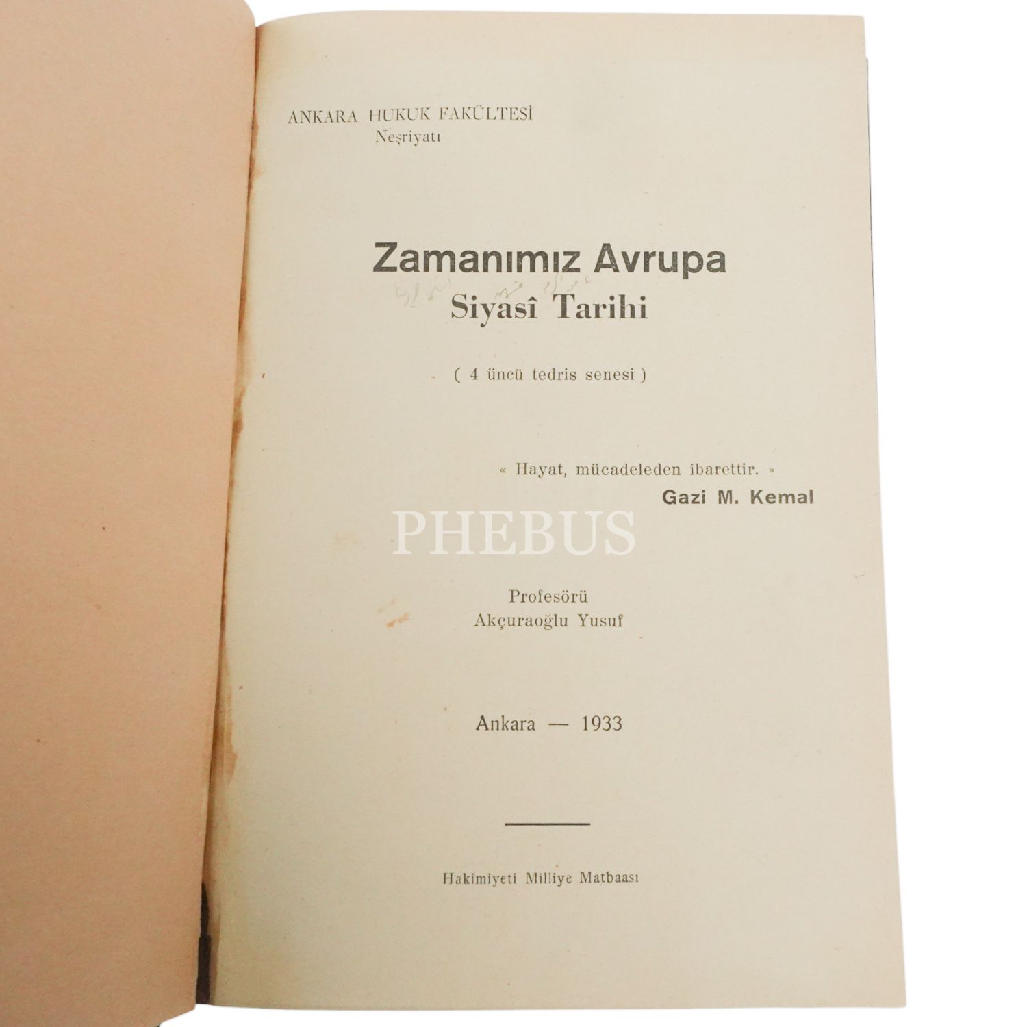 ZAMANIMIZ AVRUPA SİYASÎ TARİHİ, Akçuraoğlu Yusuf, 1933, Ankara Hukuk Fakültesi Neşriyatı, 223 sayfa...