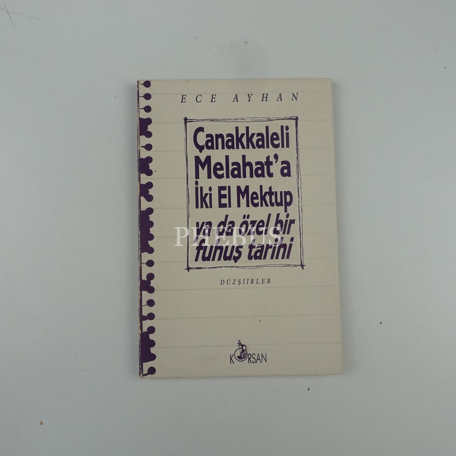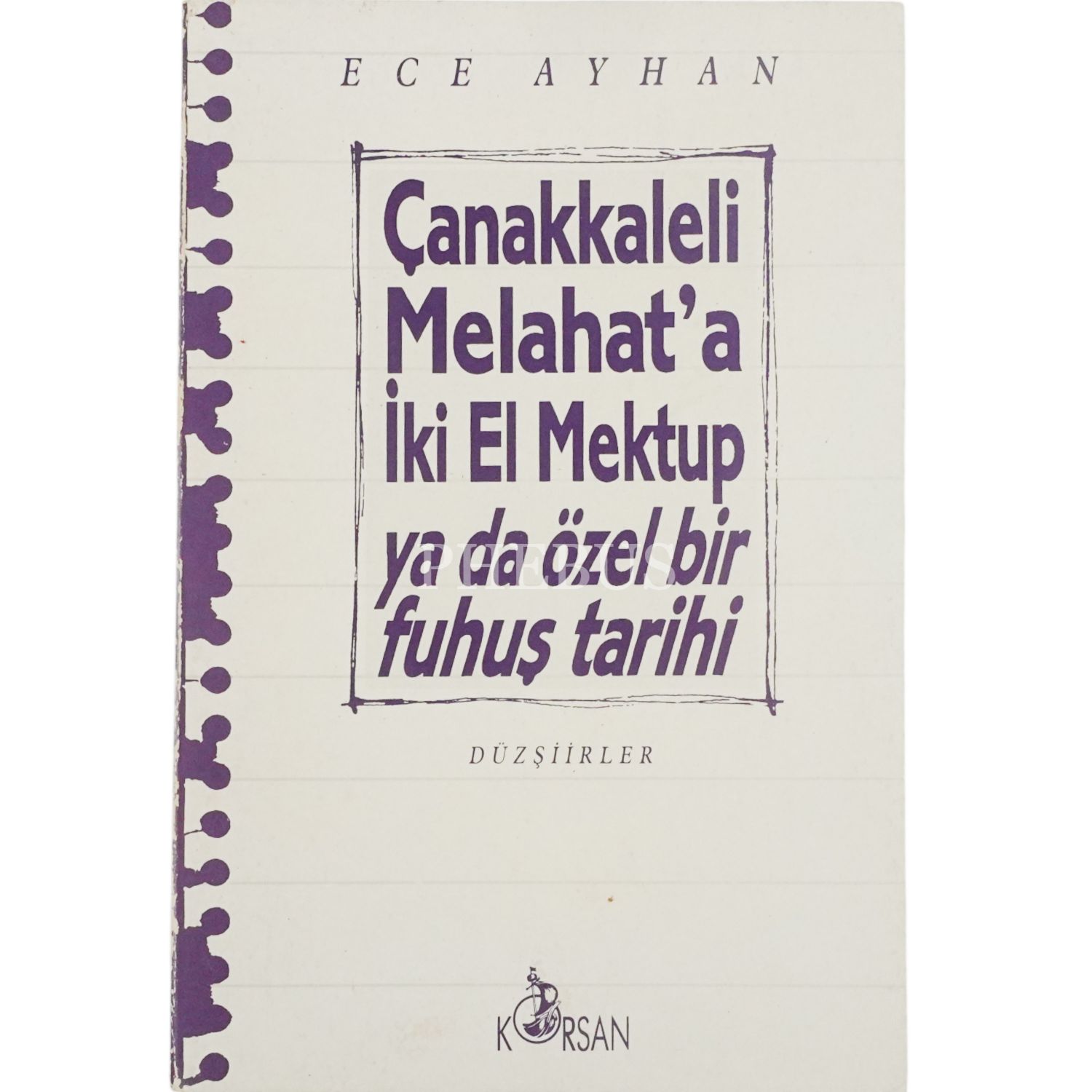 ÇANAKKALELİ MELAHAT´A İKİ EL MEKTUP YA DA ÖZEL BİR FUHUŞ TARİHİ, Ece Ayhan, 1991, Korsan Yayın, 95 sayfa...
