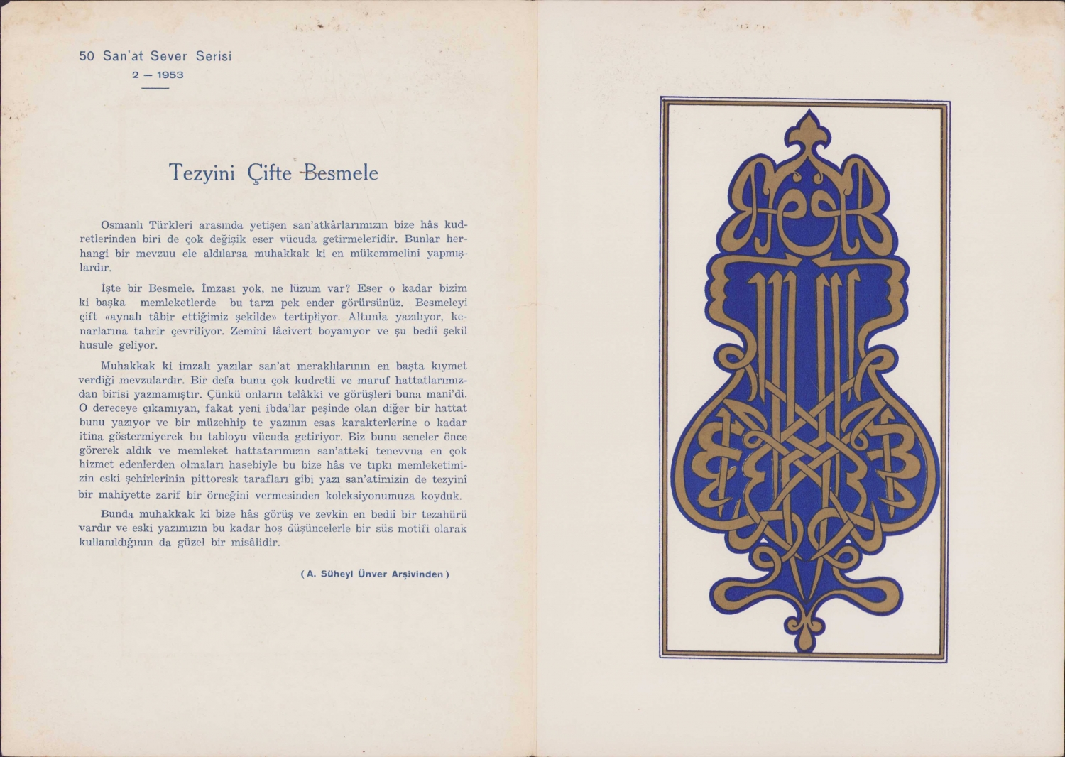 50 Sanat Sever Serisi 2 - 1953: Tezyini Çifte Besmele, Süheyl Ünver, İstanbul, 2 sayfa, 16x24 cm