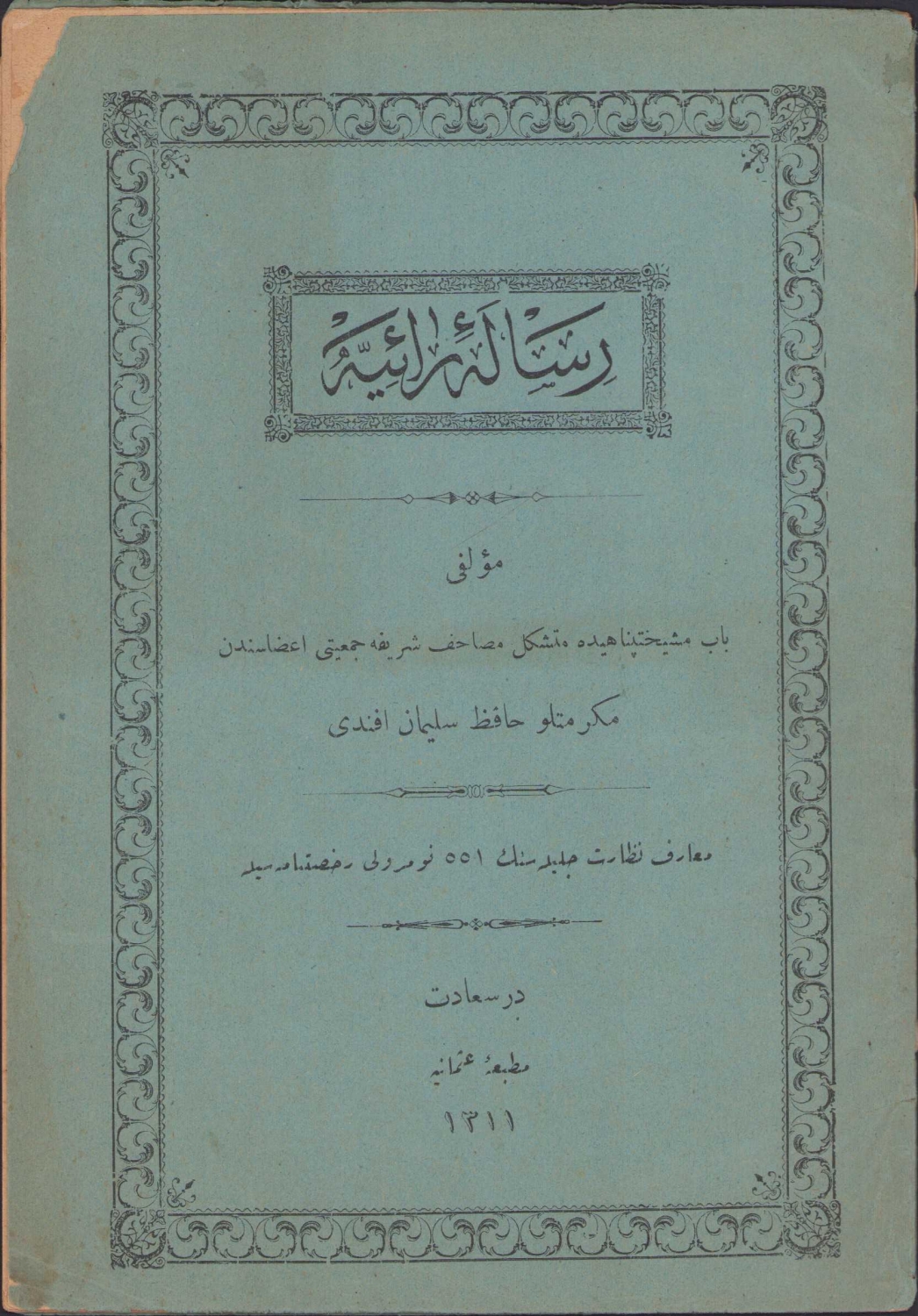 Osmanlıca Risale-i Raiyye, Hafız Süleyman Efendi, Matbaa-i Osmani, Dersaadet, 1311, 19 sayfa, 13x20 cm