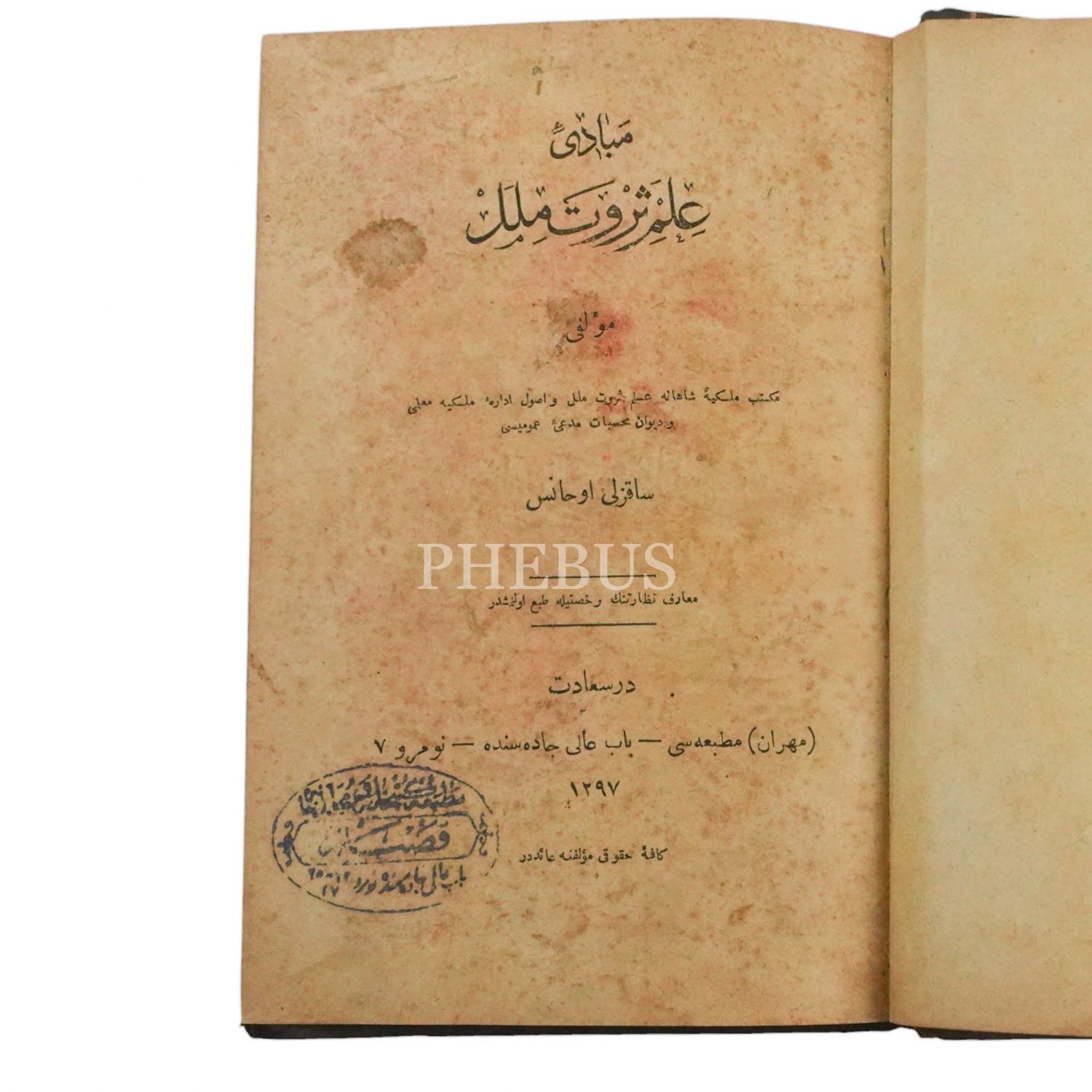 MEBADİ-İ İLM-İ SERVET-İ MİLEL, Sakızlı Ohannes Paşa, 1297, Mihran Matbaası, 441 sayfa, 14x20 cm...