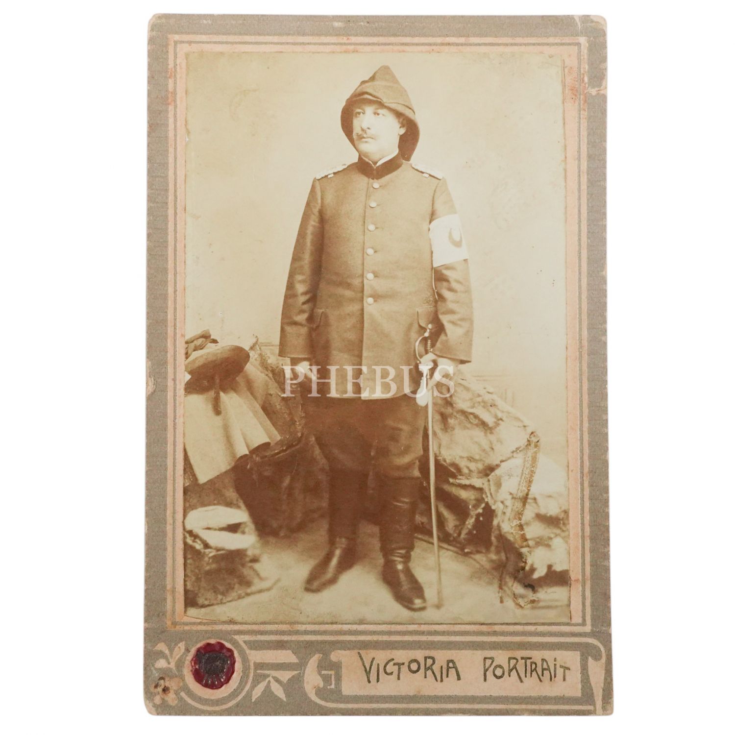 Cihan Harbi yıllarından, Hilal-i Ahmer pazubentli ve Enveriye (Kabalak) şapkalı bir tabip subayın stüdyo kabin fotoğrafı, 8x12 cm...