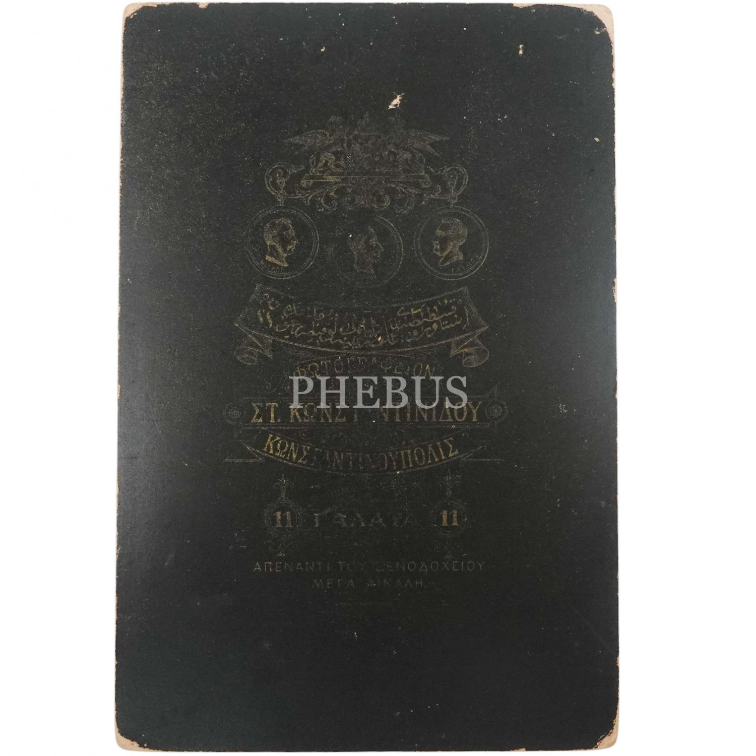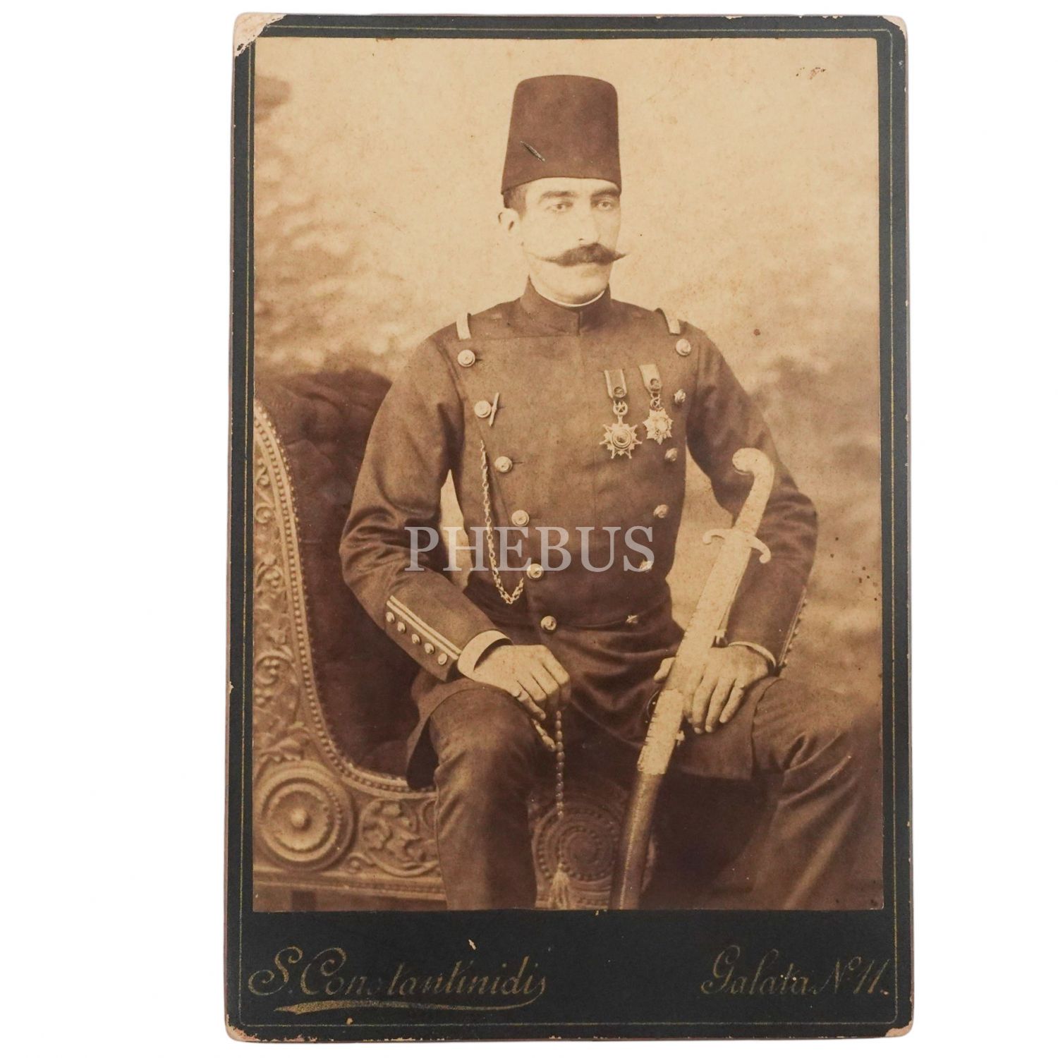 Bir elinde kılıcı, bir elinde tespihi ile poz veren Osmani ve Mecidi nişanlı bir Osmanlı subayının stüdyo kabin fotoğrafı, S. Constantinidis - Galata, Constantinople, 11x17 cm...