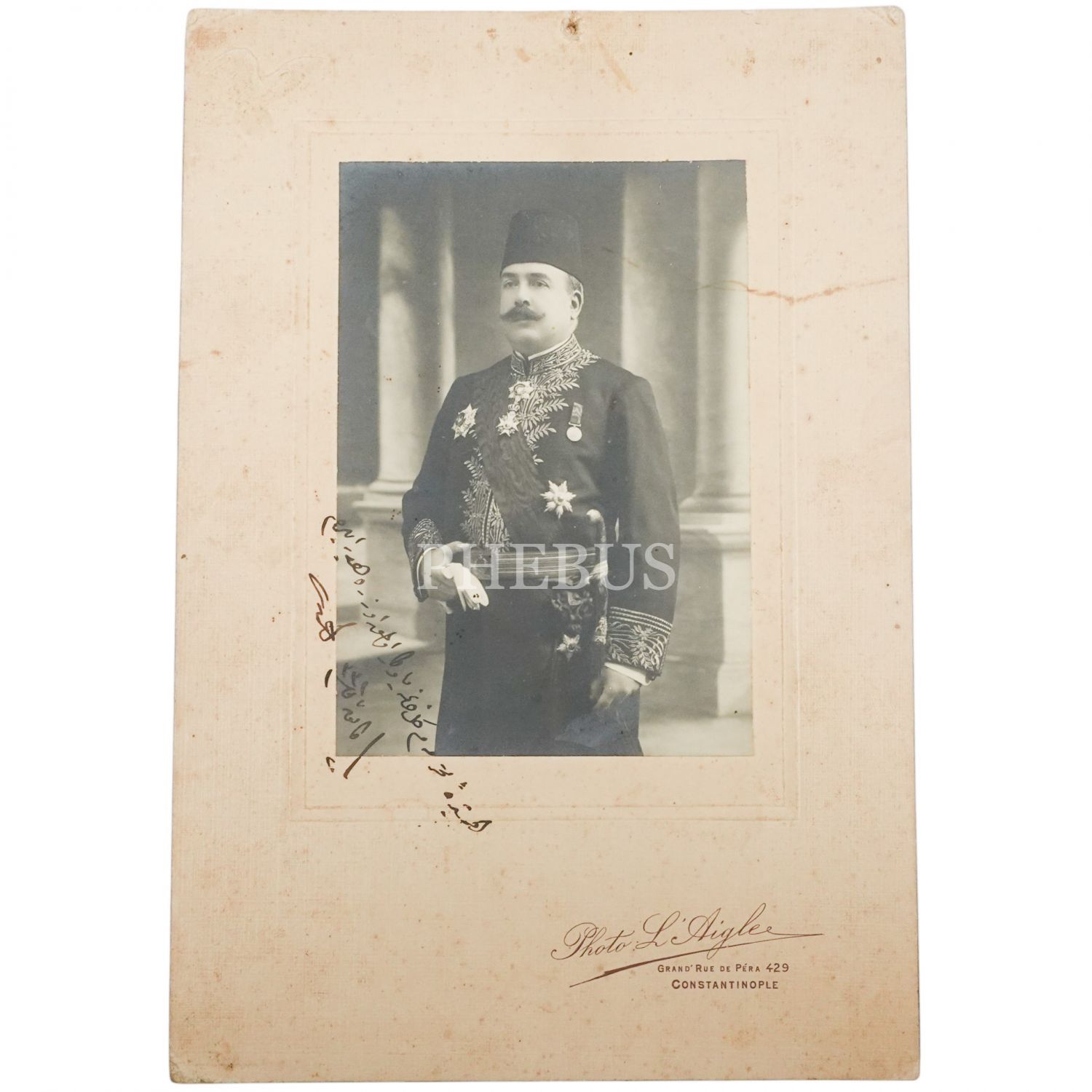 1926 yılında Mustafa Kemal Atatürk´e İzmir´de yapılması planlan suikastın arkasında olan Terakkiperver Cumhuriyet Fırkası´nın kurucularından ve İzmir Suikasti davasında idam edilen Ahmet Şükrü (Bayındır) Bey´in, Osmanlı Devleti´nde Maarif Nazırlığı görevinde bulunduğu sırada "Photo L´Aigle - Constantinople" stüdyosunda çektirdiği ithaflı ve imzalı fotoğrafı, 20 Kanunuevvel 1331 (2 Ocak 1916), 17x25 cm...