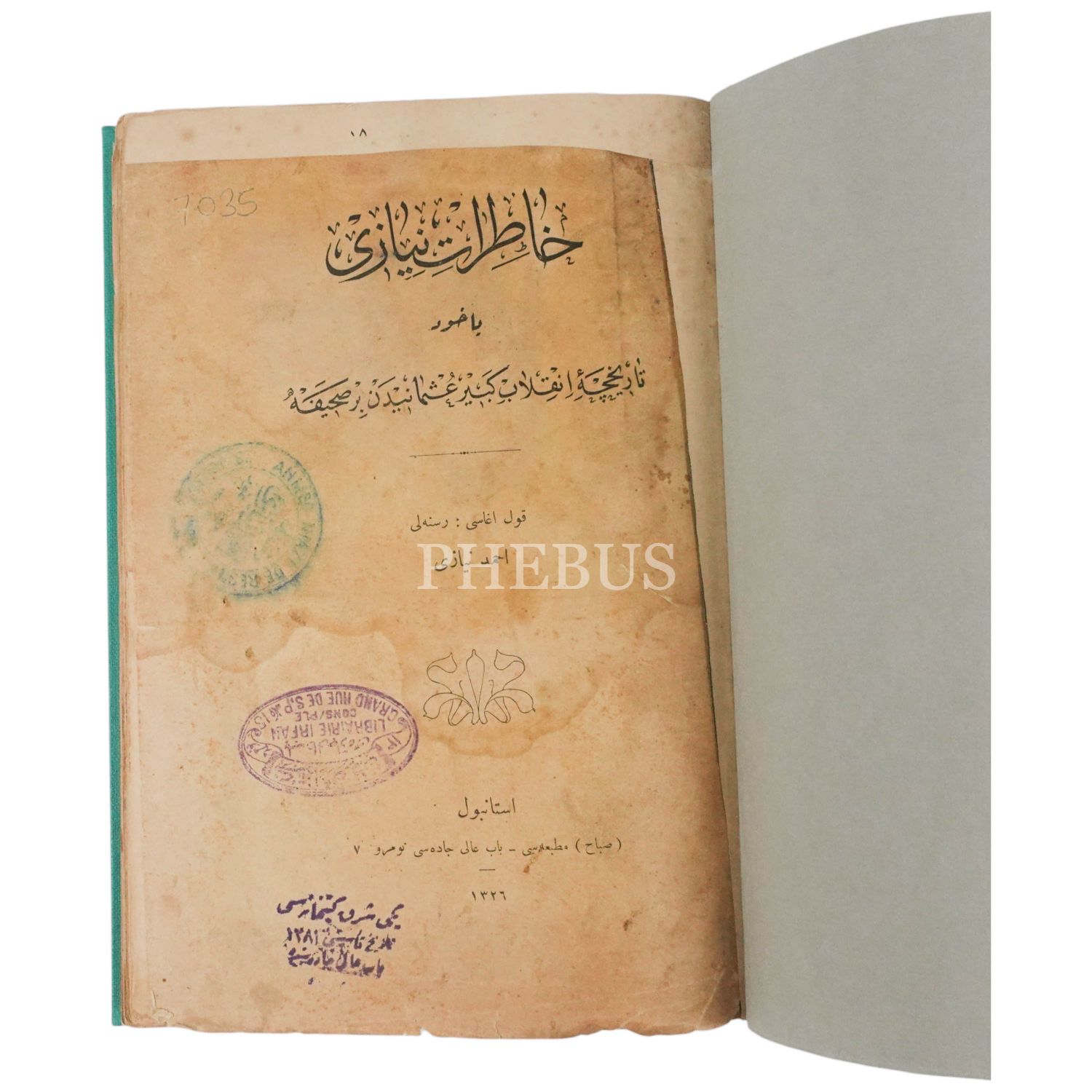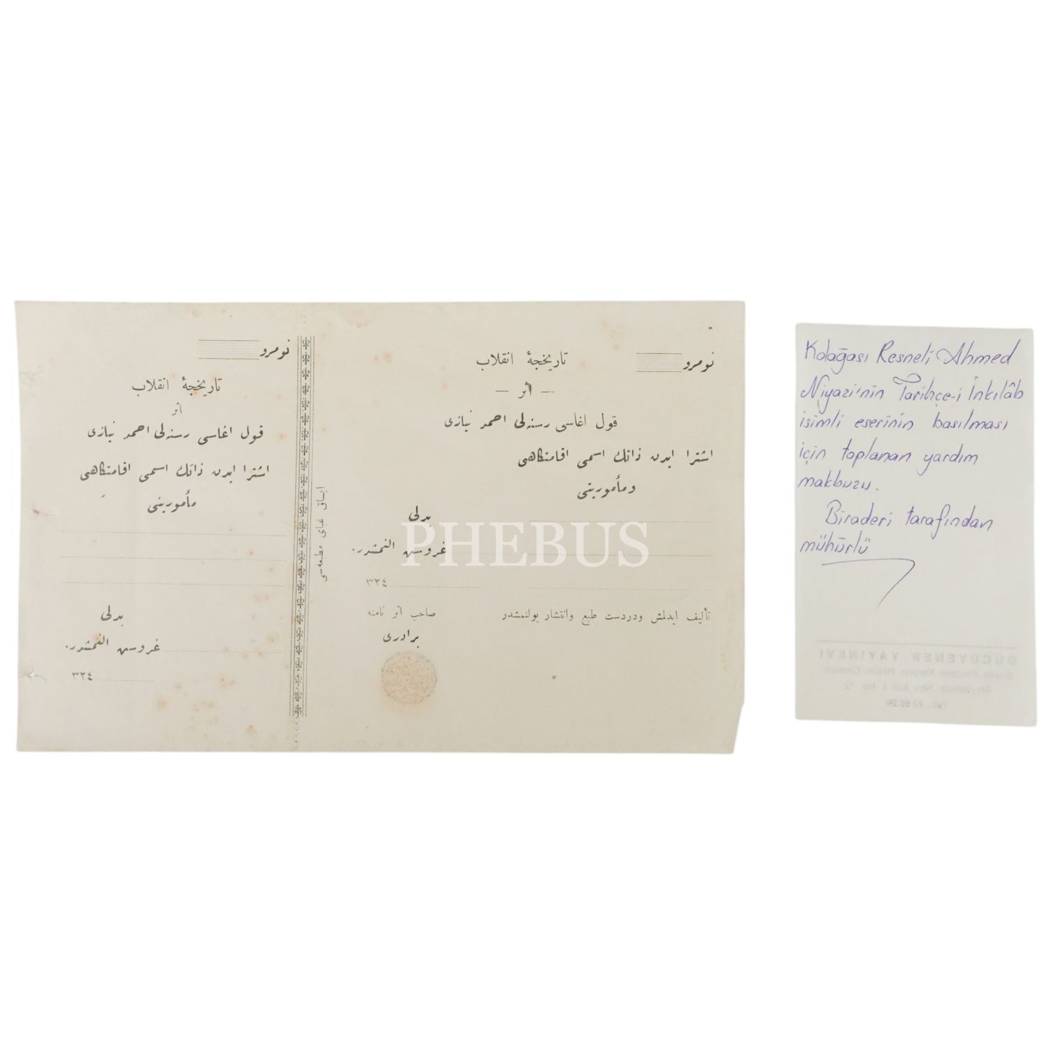 HATIRAT-I NİYAZİ YAHUD TARİHÇE-İ İNKILAB-I KEBİR-İ OSMANİ´DEN BİR SAHİFE adlı eseri ve bu eserin basılması için toplanan yardım makbuzu...
