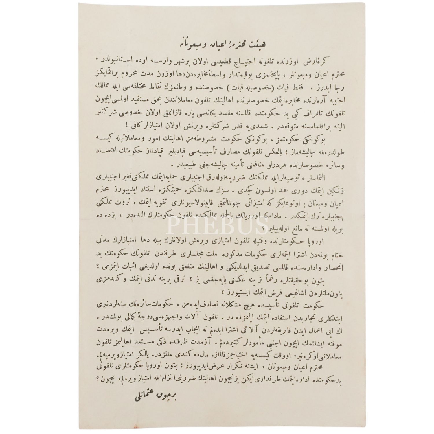 İstanbul´a telefon getirilmesi gerektiğine dair "bir çok Osmanlı" imzasıyla kaleme alınmış ve Meclis-i Mebusan´a sunulmuş dilekçe, 14x20 cm...