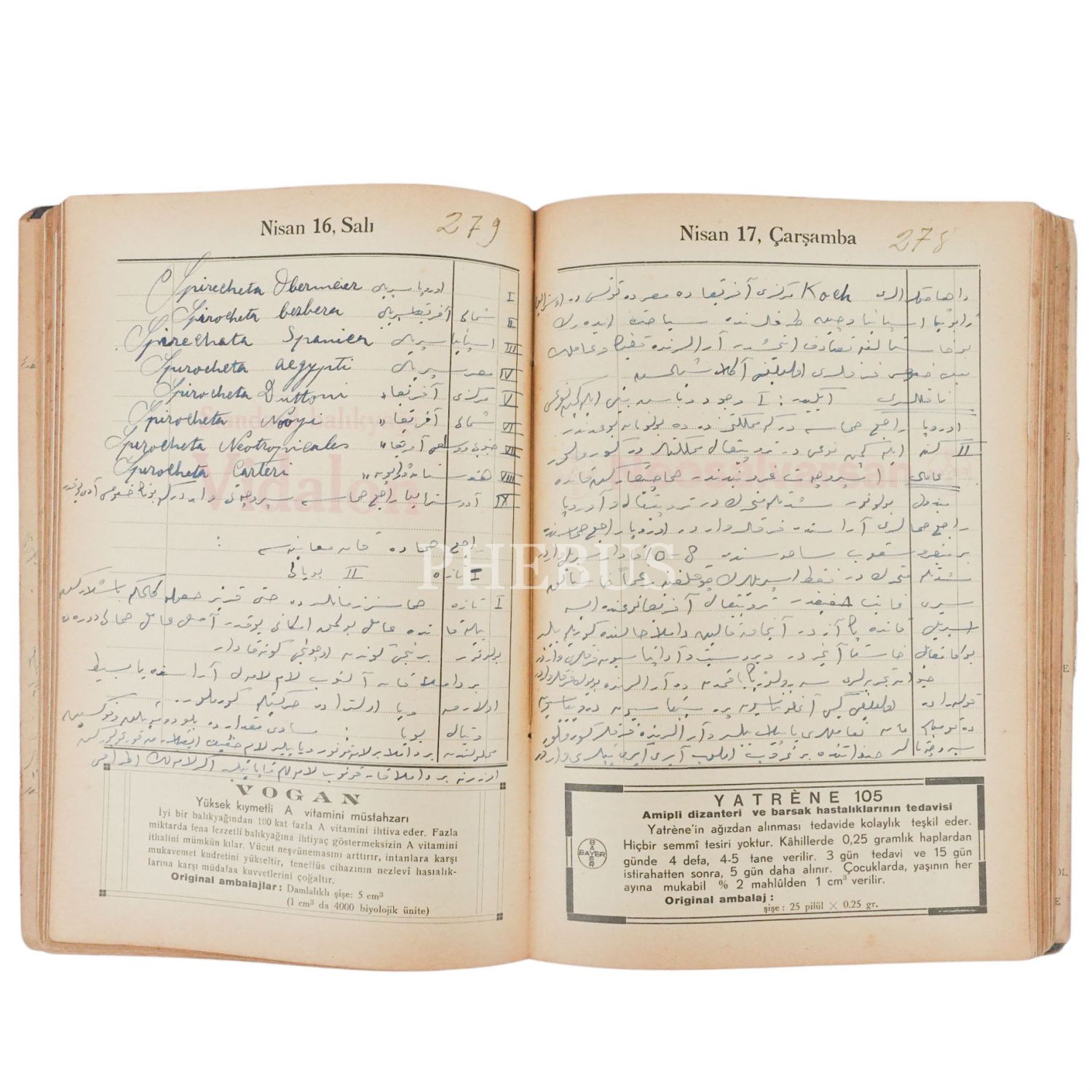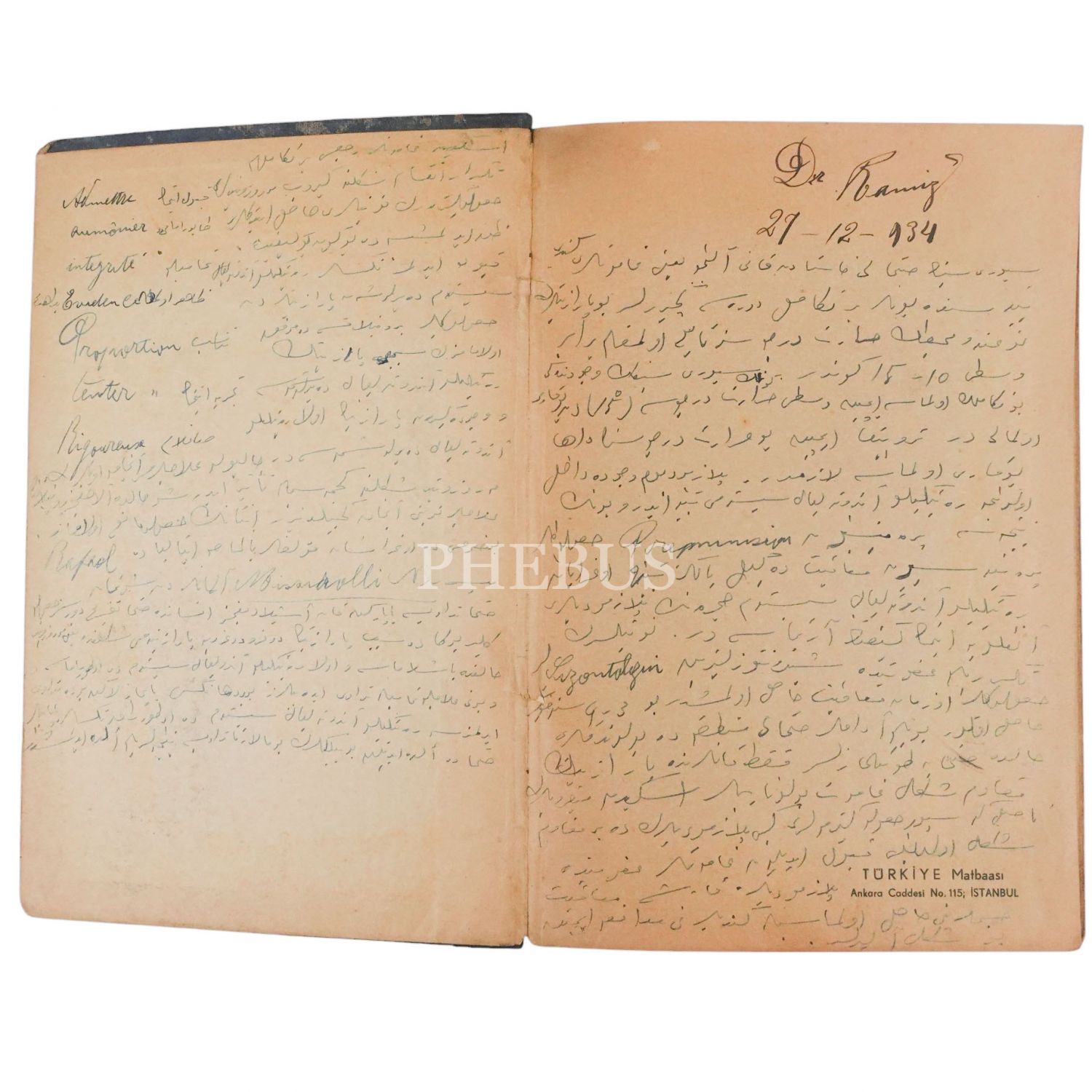 1935 senesinde Bayer firması tarafından verilen "Tıbbi Agenda" defteri üzerine, Dr. Ramiz imzasıyla; difteri, humma, çiçek, kabakulak, kızamık, tetanos gibi hastalıklar hastalıklar hakkında Osmanlıca ile kaleme alınmış bir dahiliye (iç hastalıkları) doktorunun defteri, 16x23 cm...