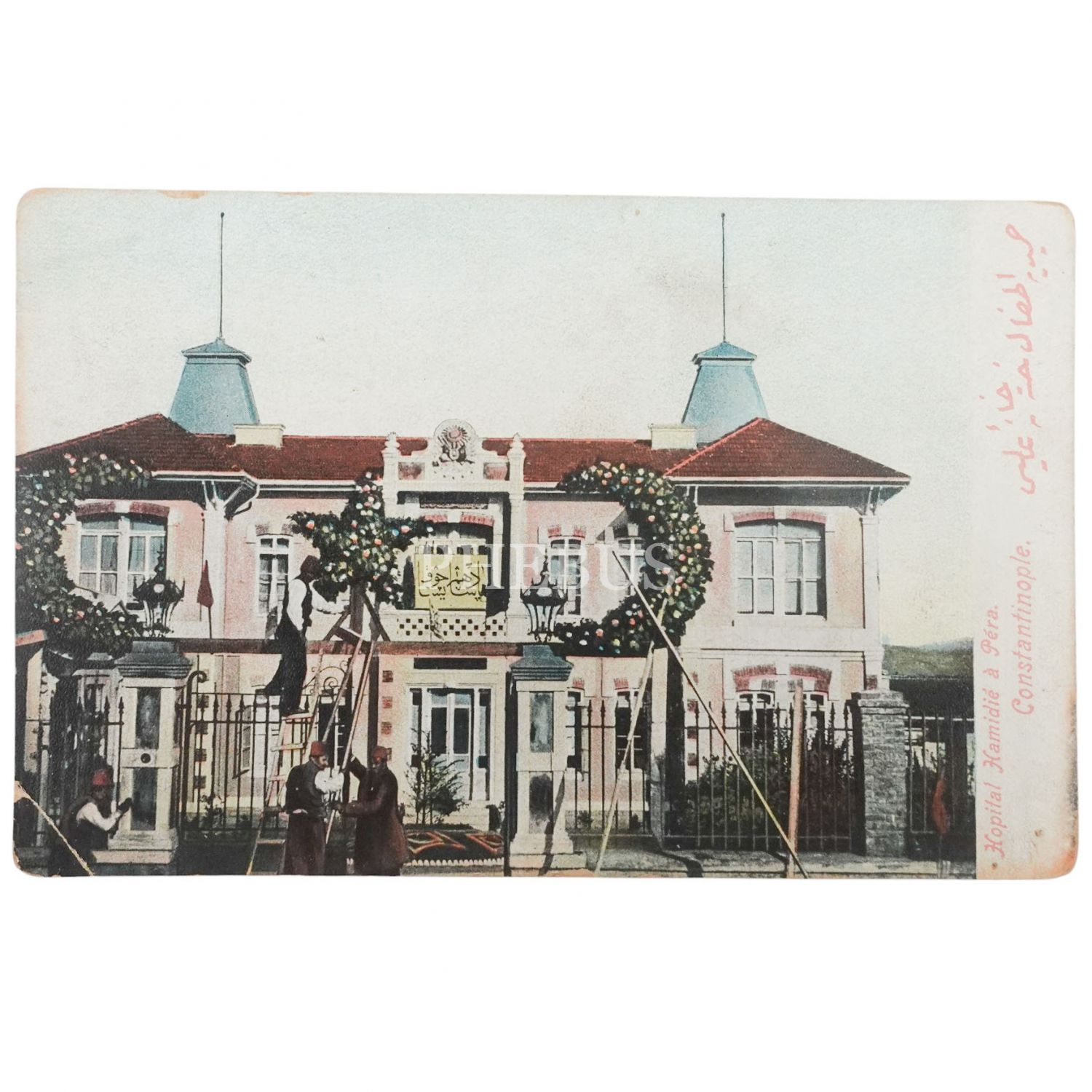 Sultan II. Abdülhamid´in emriyle 5 Haziran 1899 tarihinde hizmete açılan Türkiye’nin ilk çocuk hastanesi Şişli Hamidiye Etfal (Çocuklar) Hastahanesi´nin açılışı, bina balkonundaki tabelada “Padişahım Çok Yaşa” yazılıdır, ed.: M.J.C., 14x9 cm...