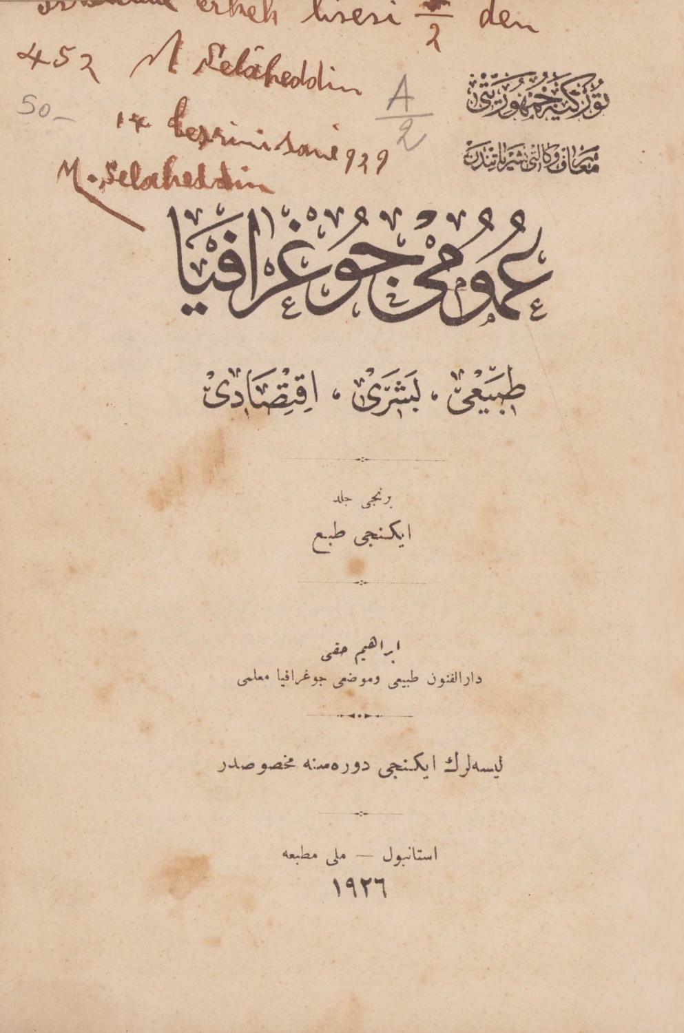 Osmanlıca Umumi Coğrafya - Tabii, Beşeri, İktisadi - birinci cilt, Gallouédéc, Louis - Maurette, Fernand, çev., İbrahim Hakkı, ikinci baskı, Milli Matbaa, İstanbul, 1926,