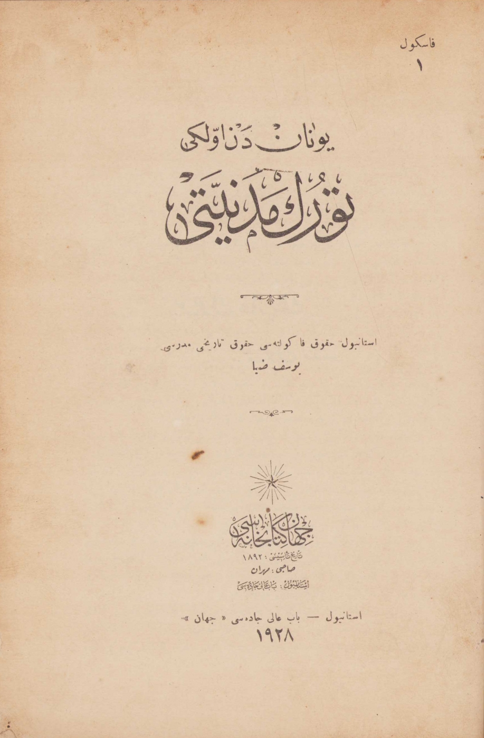 Osmanlıca Yusuf Ziya'nın Yunandan Evvelki Türk Medeniyeti, İstanbul, 1928, yeni cildinde, 278 sayfa, 15x23 cm