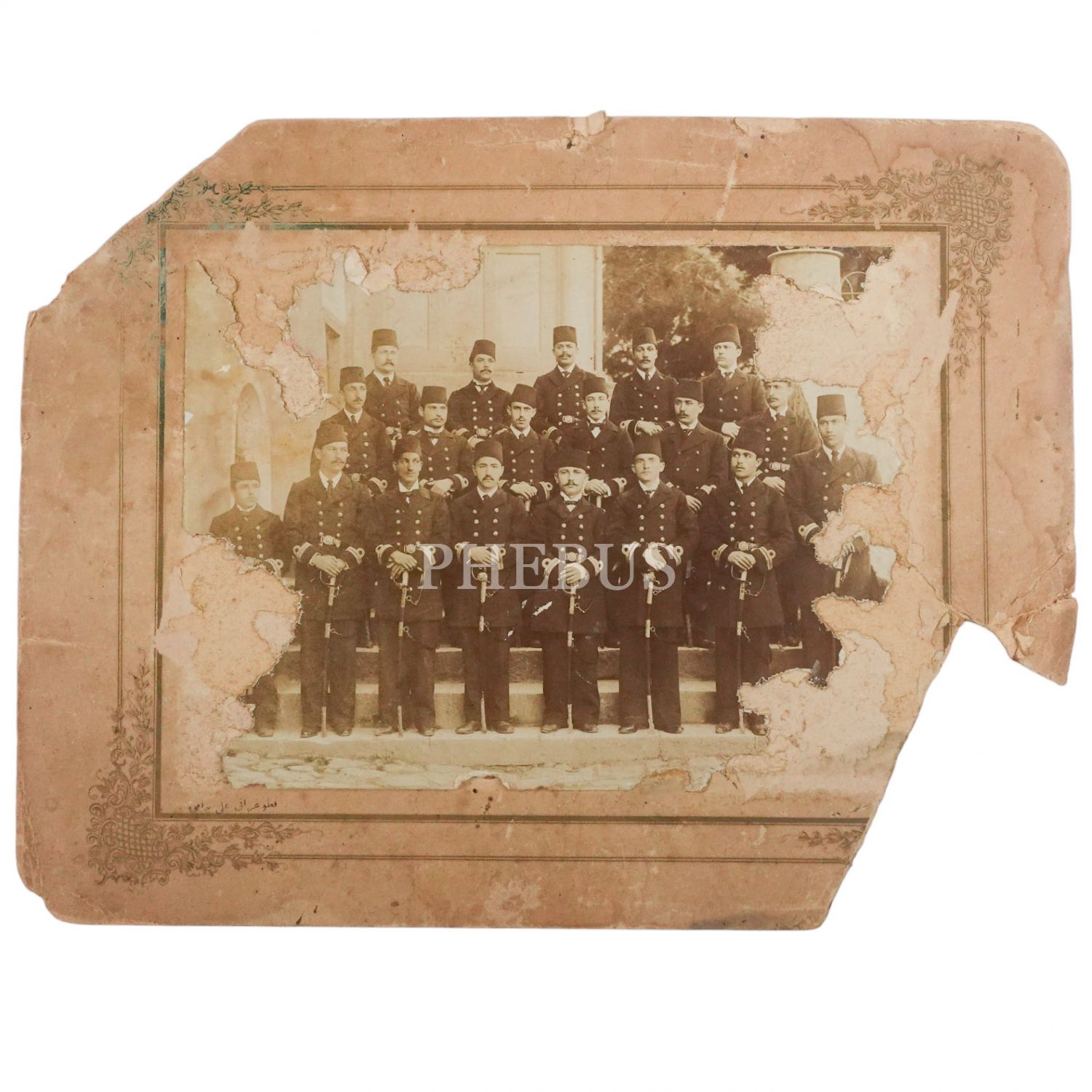 Osmanlı döneminden bir grup denizci subayın ellerinde kılıçlarıyla aldırdıkları toplu hatıra fotoğrafı, fotoğraf 23x17 cm, paspartu 33x25 cm...
